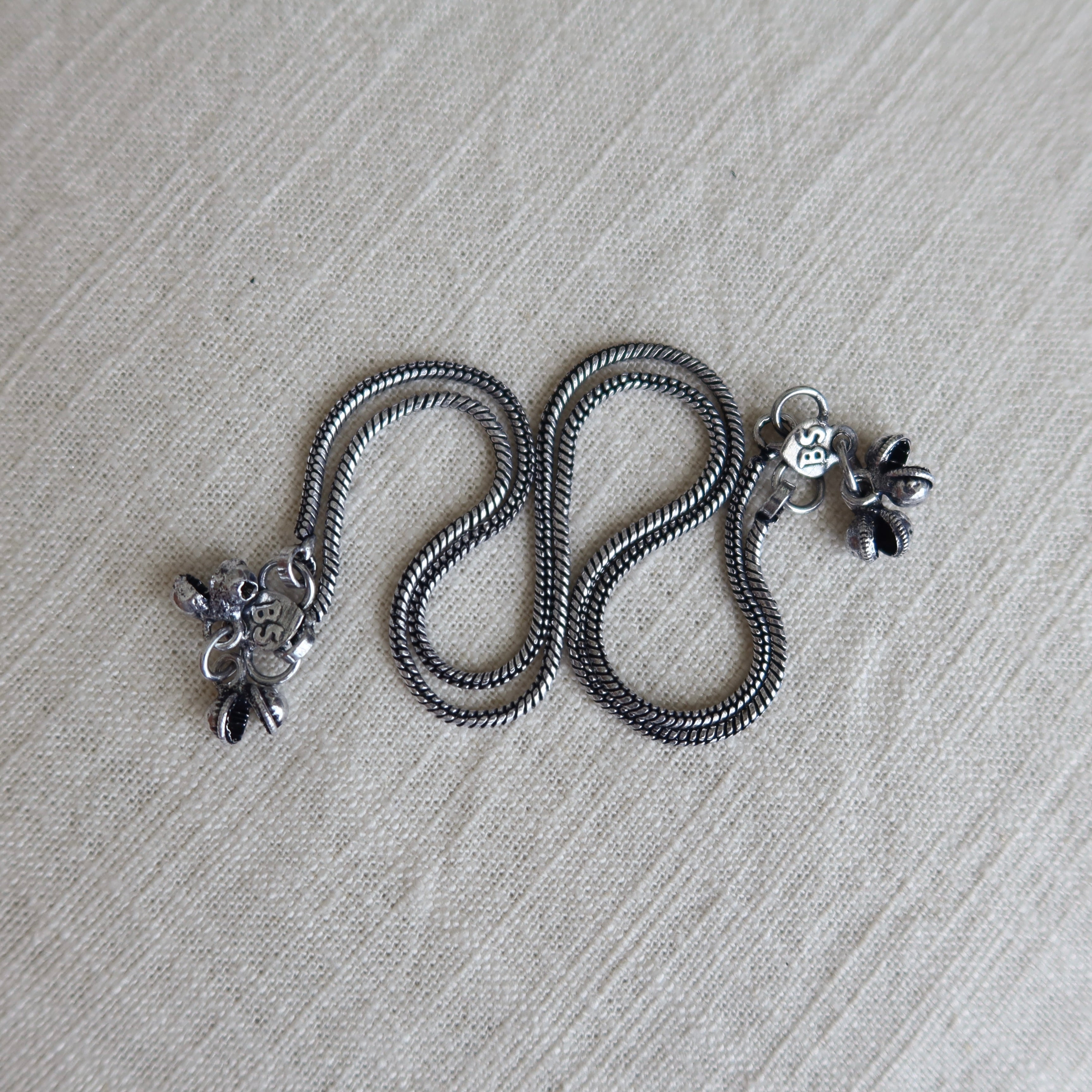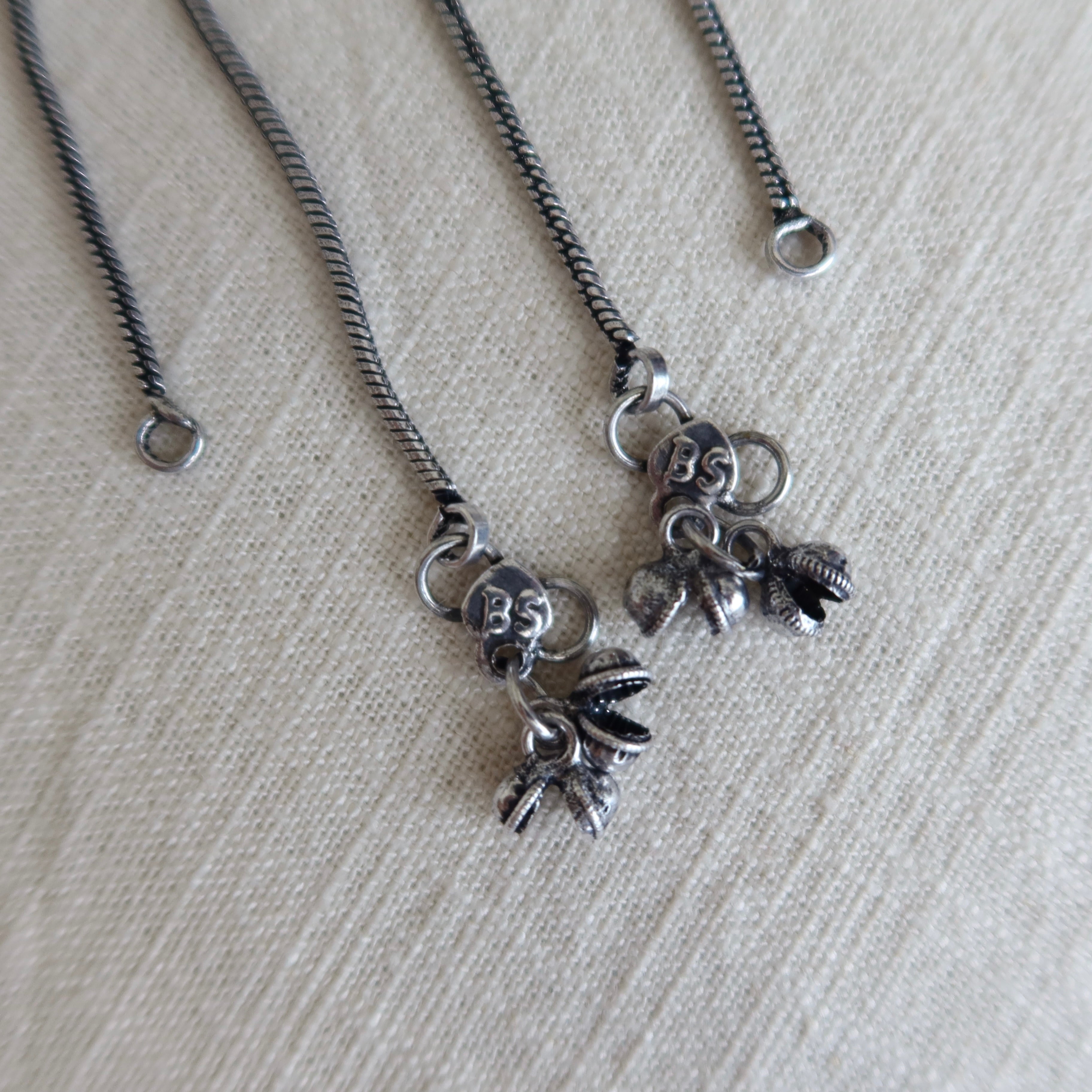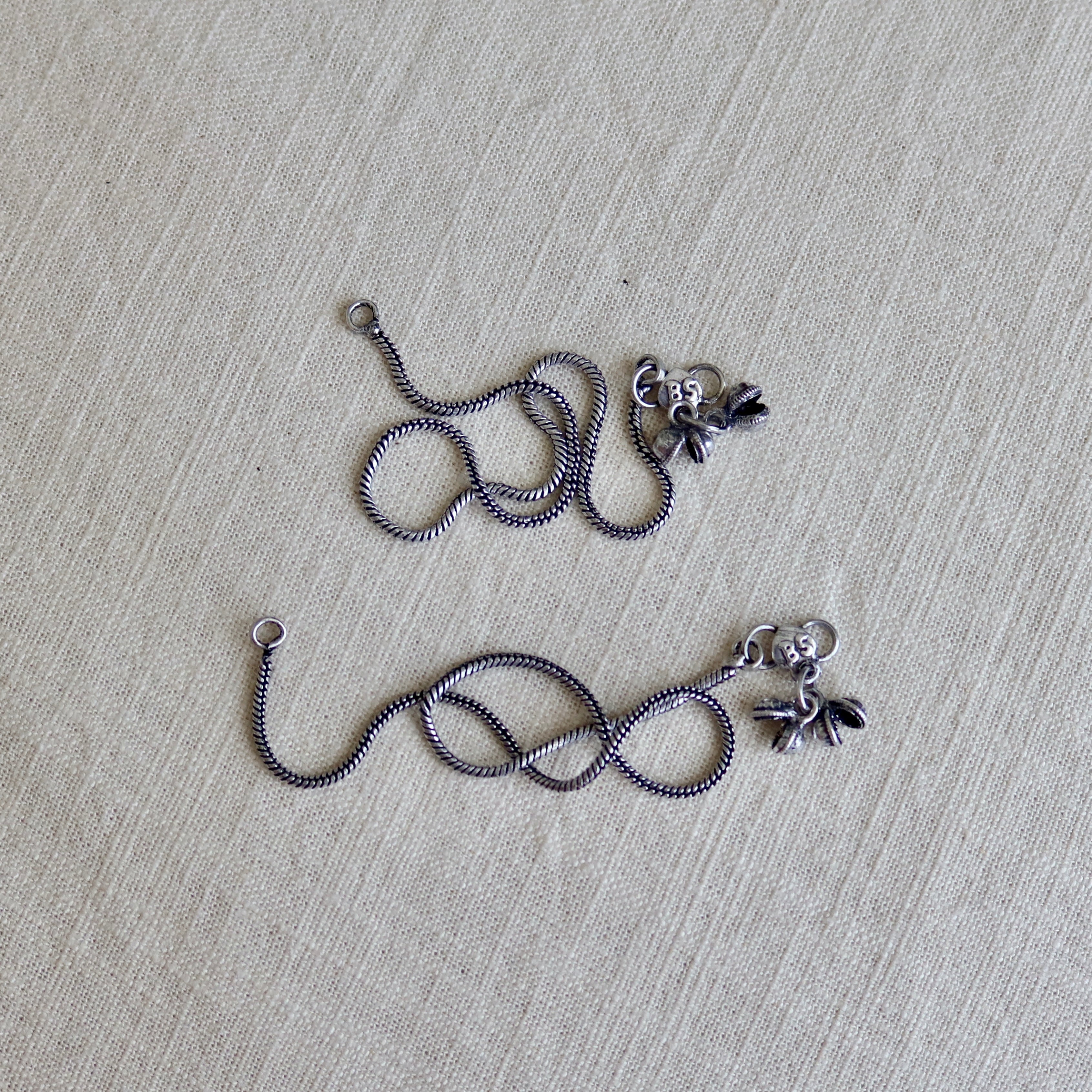 A delicate pair of silver anklets featuring intricate designs, perfect for adding a traditional and elegant touch to your ethnic ensemble.