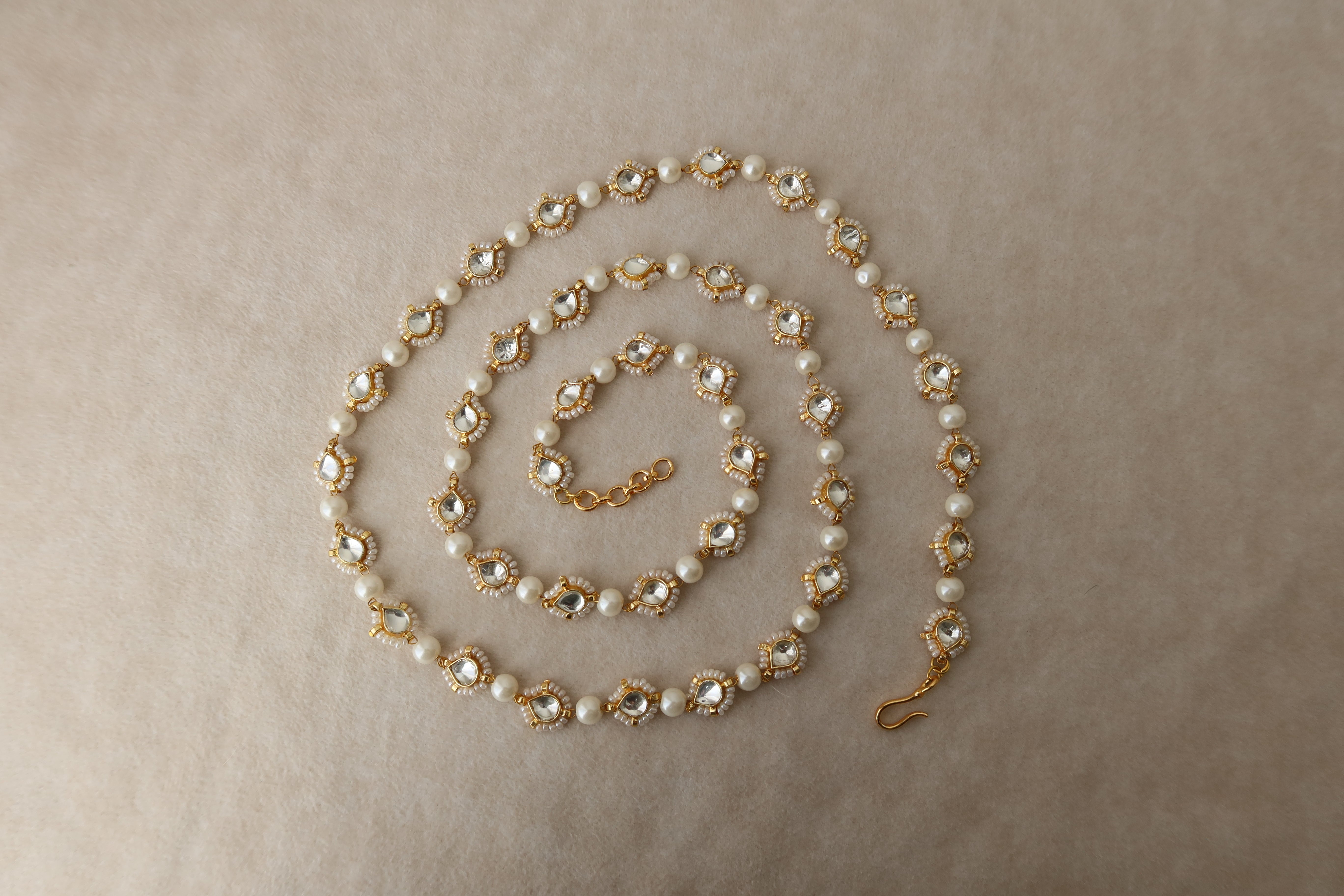 This slender waist belt features a continuous strand of teardrop-shaped Kundan stones, each meticulously framed by petite seed pearls. Designed to accentuate your silhouette, its lightweight and flexible structure makes it an effortless addition to sarees, lehengas, or even a modern fusion look.