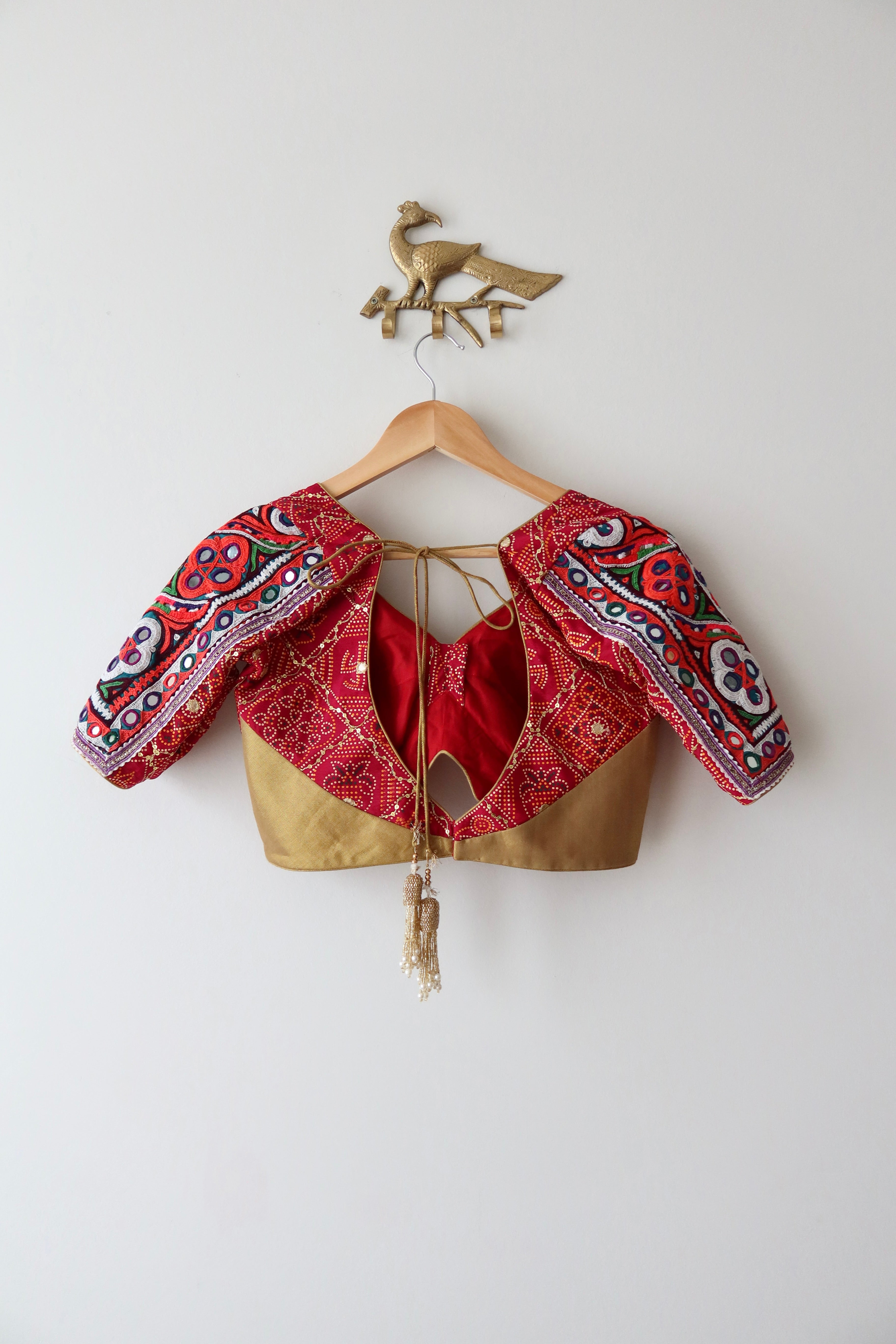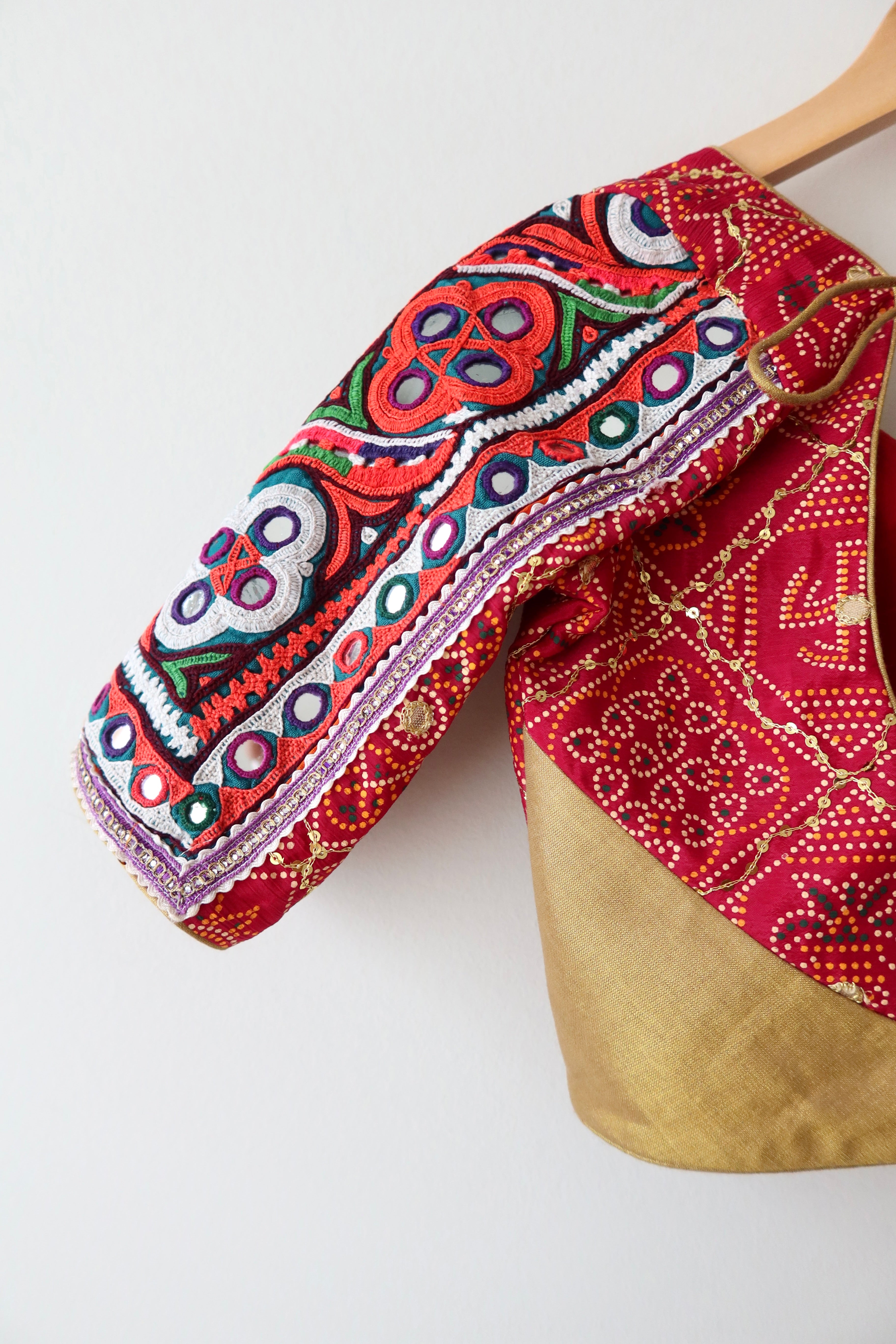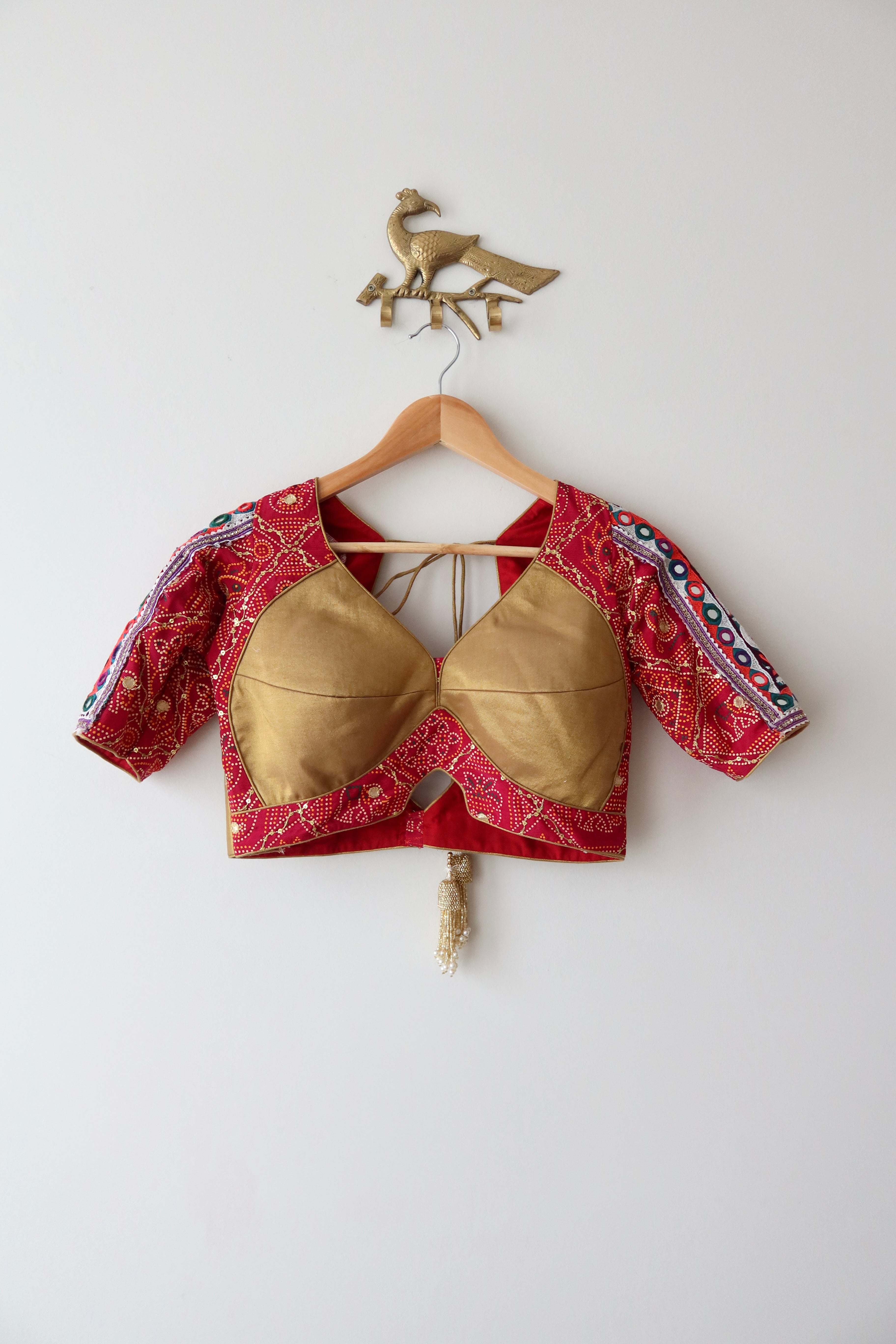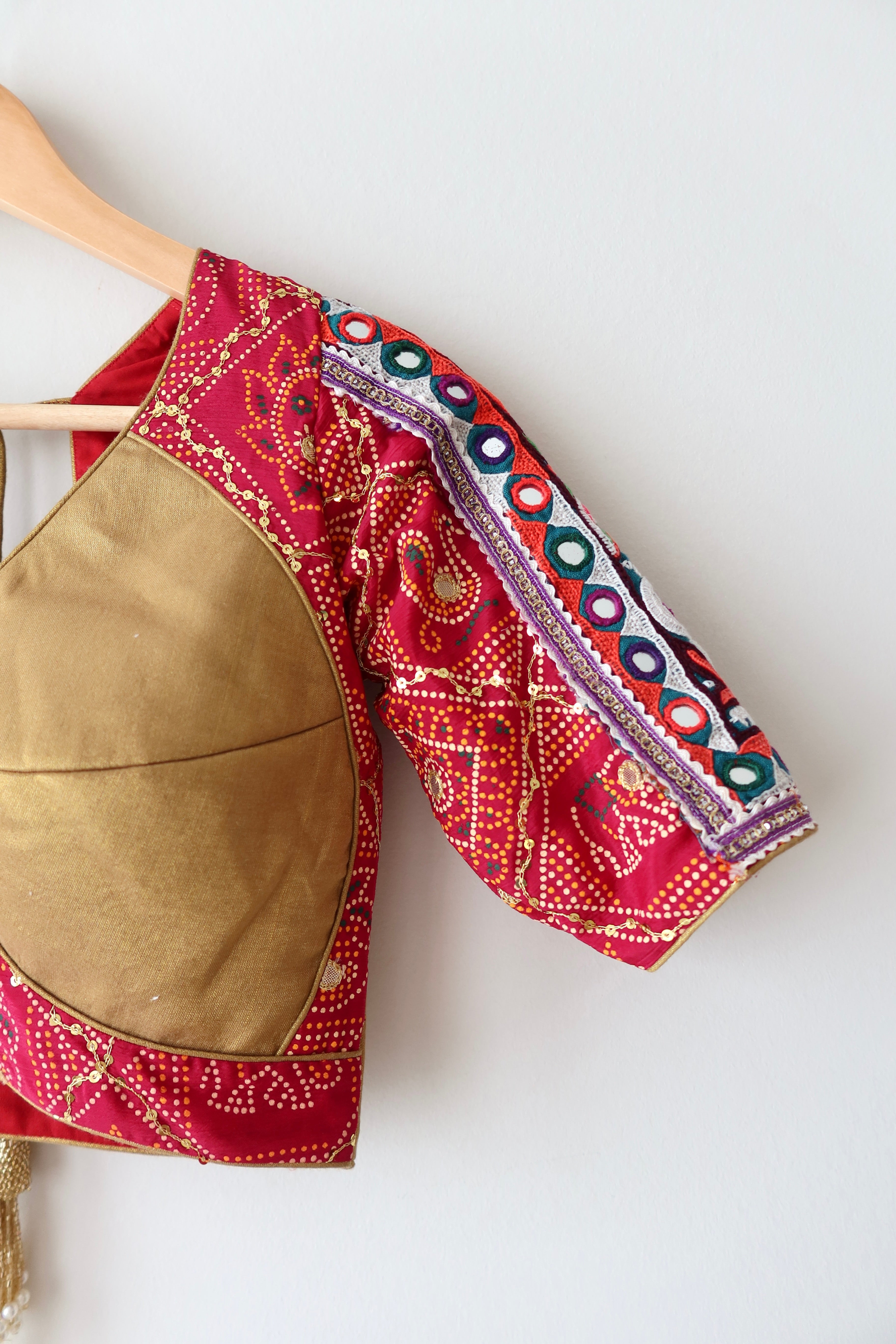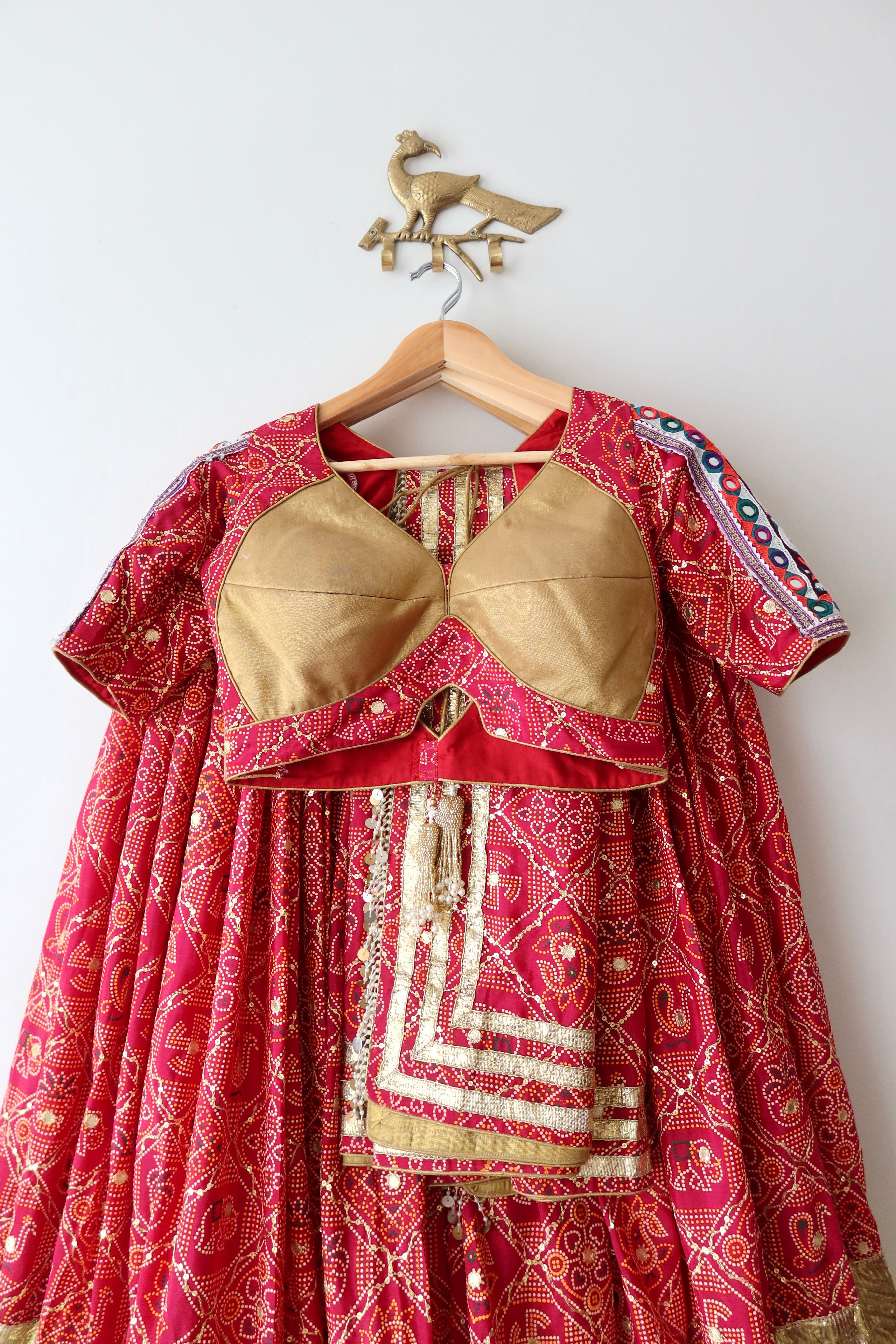Features: 3-piece set with hand embroidered blouse, skirt, and dupatta. Large gold Gota pati skirt border, bandhani dyed fabric, heavily embroidered dupatta borders, Rabari/mirrorchain stitch embroidered on blouse.