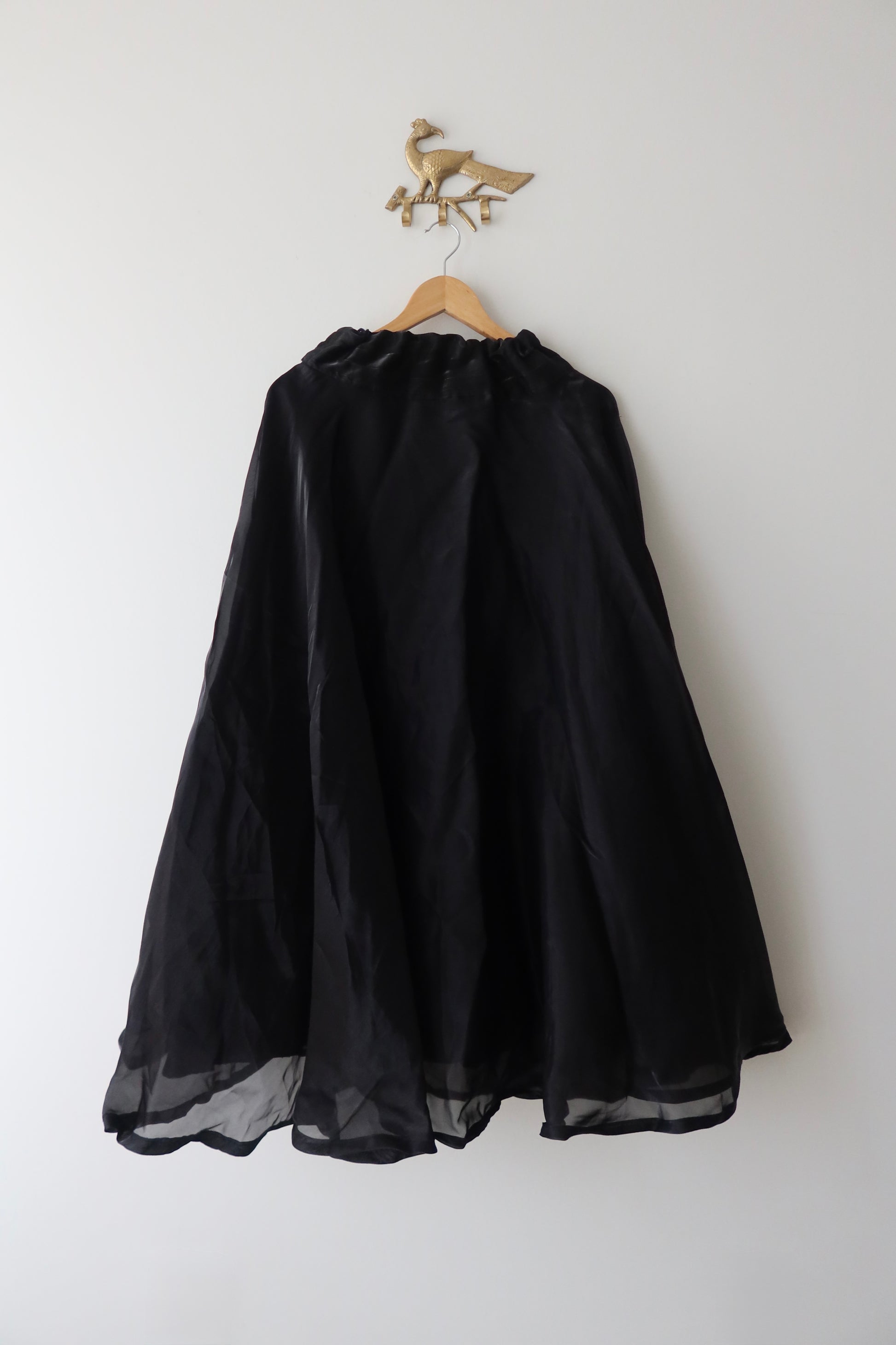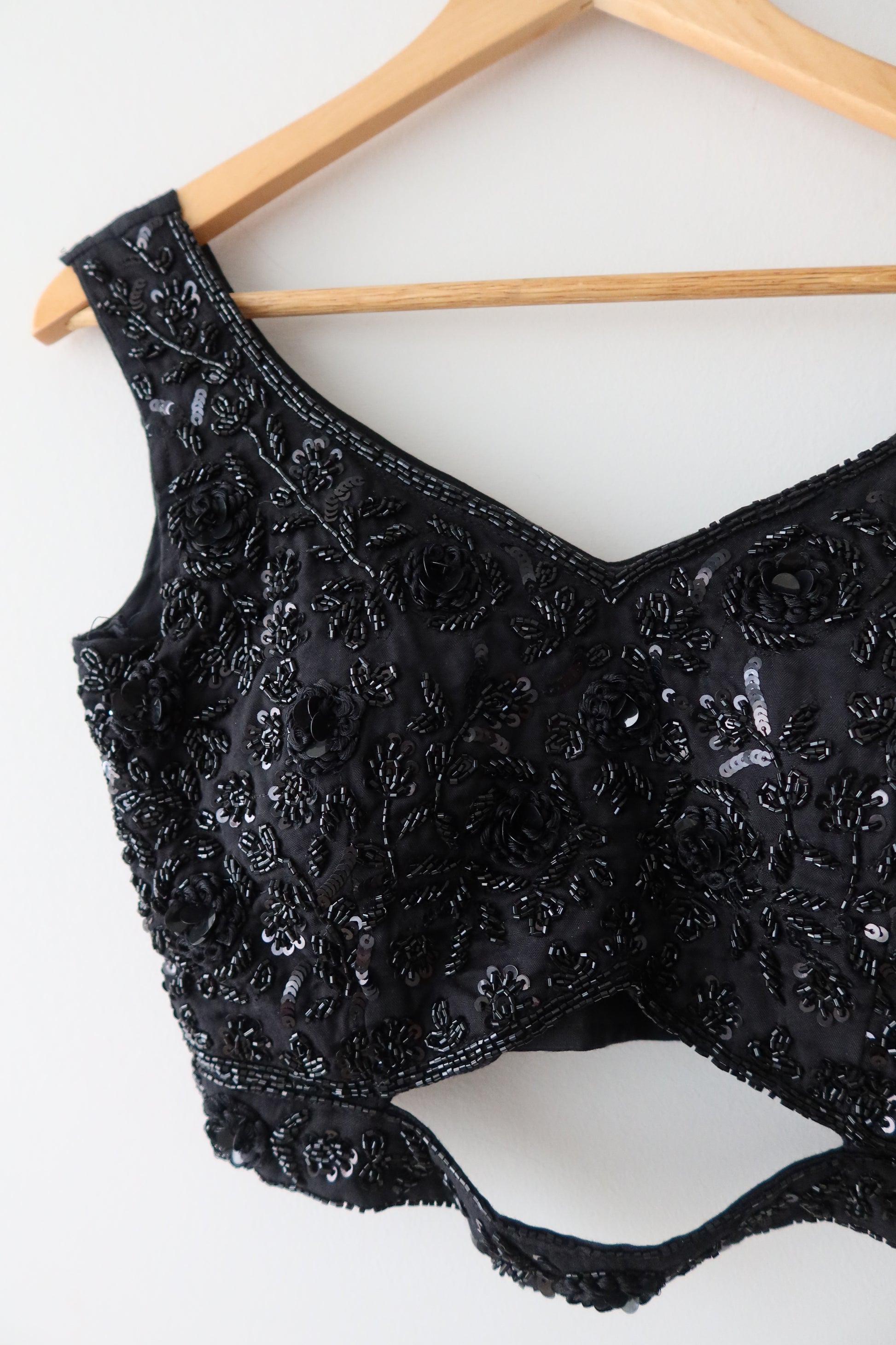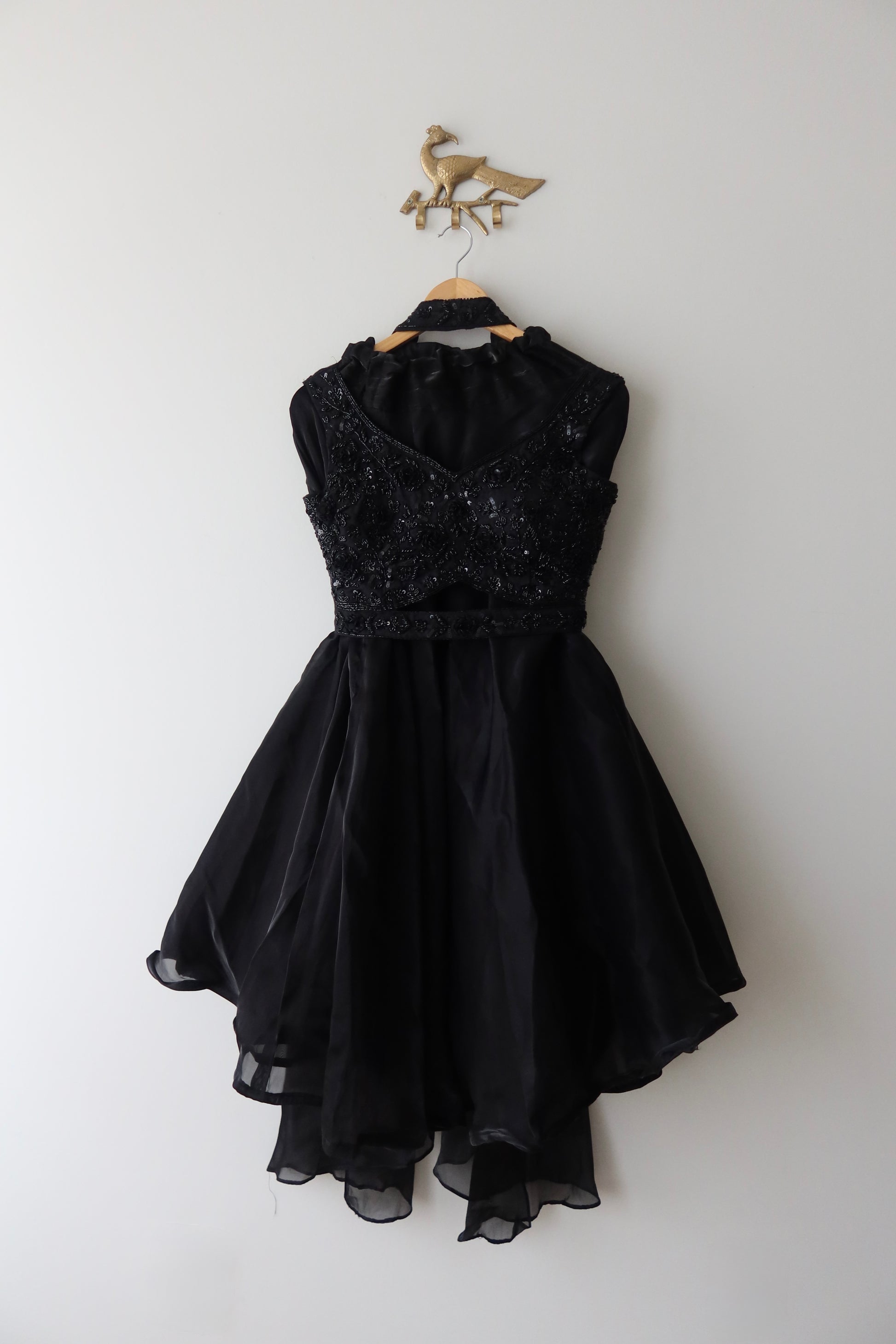 Stunning jet-black sleeveless blouse with heavy tonal embroidery + flowy organza skirt & matching dupatta