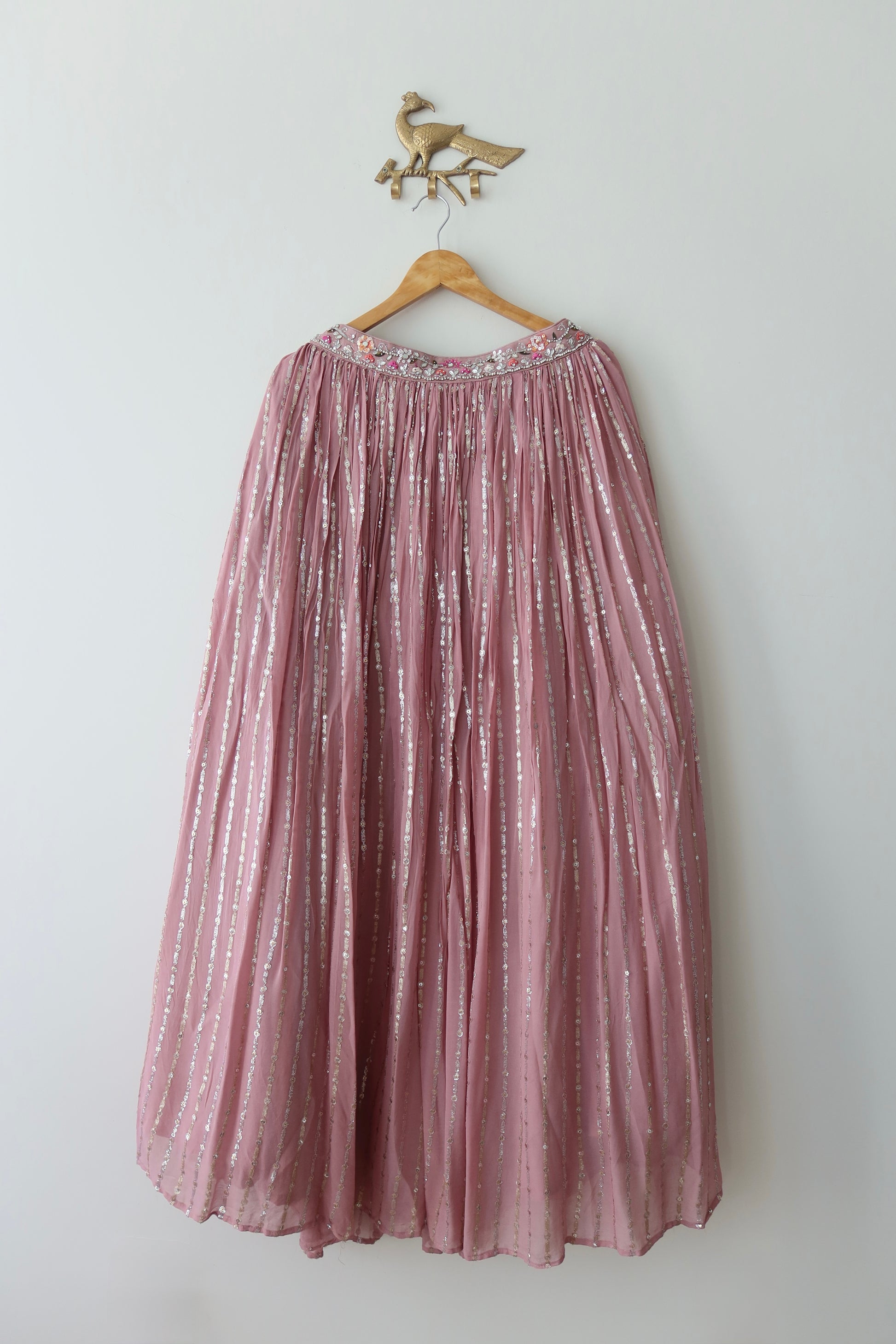 Embroidered blouse with see-through net back, georgette skirt with cancan, blush pink matching dupatta with mirrorwork border.