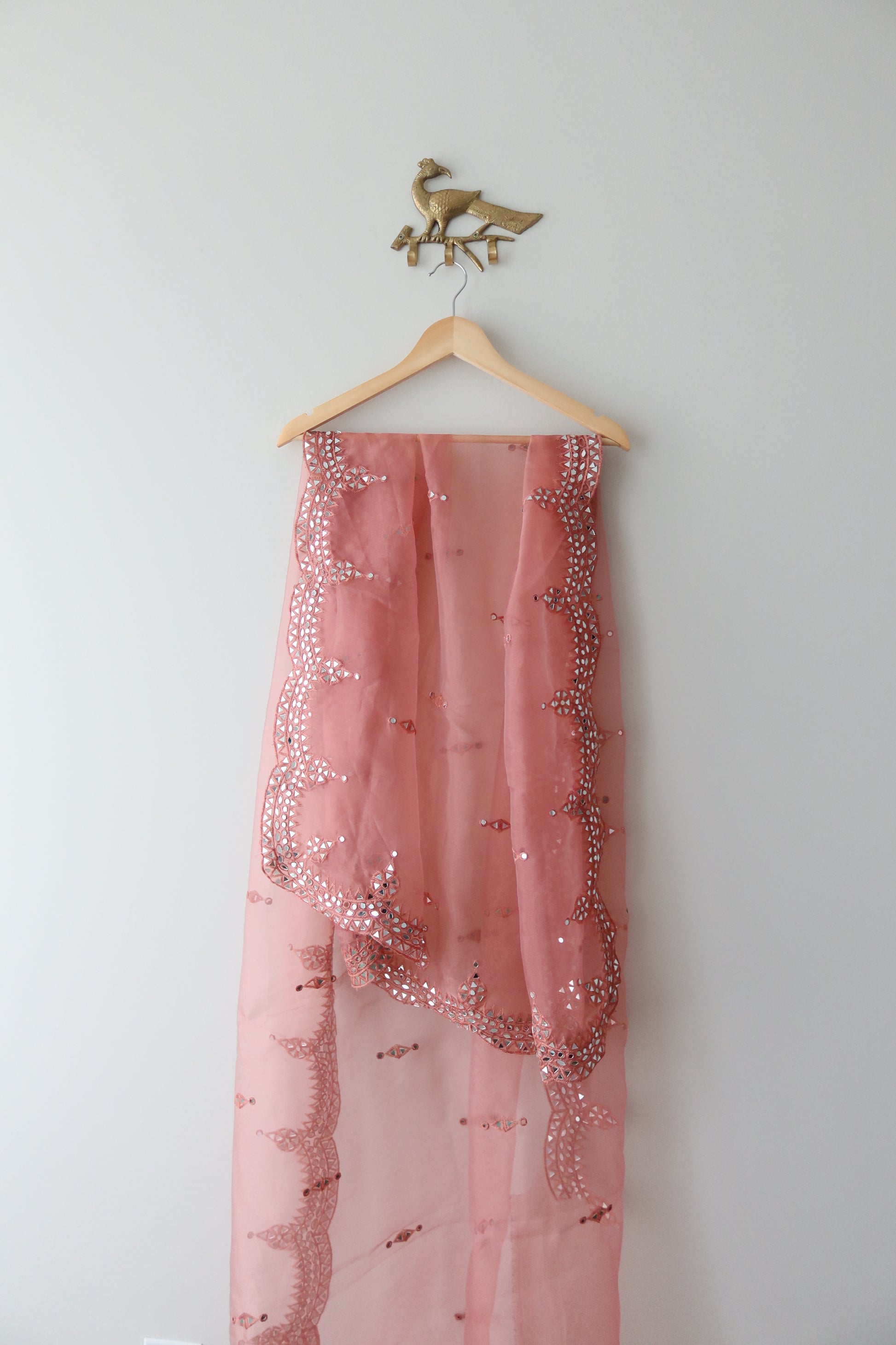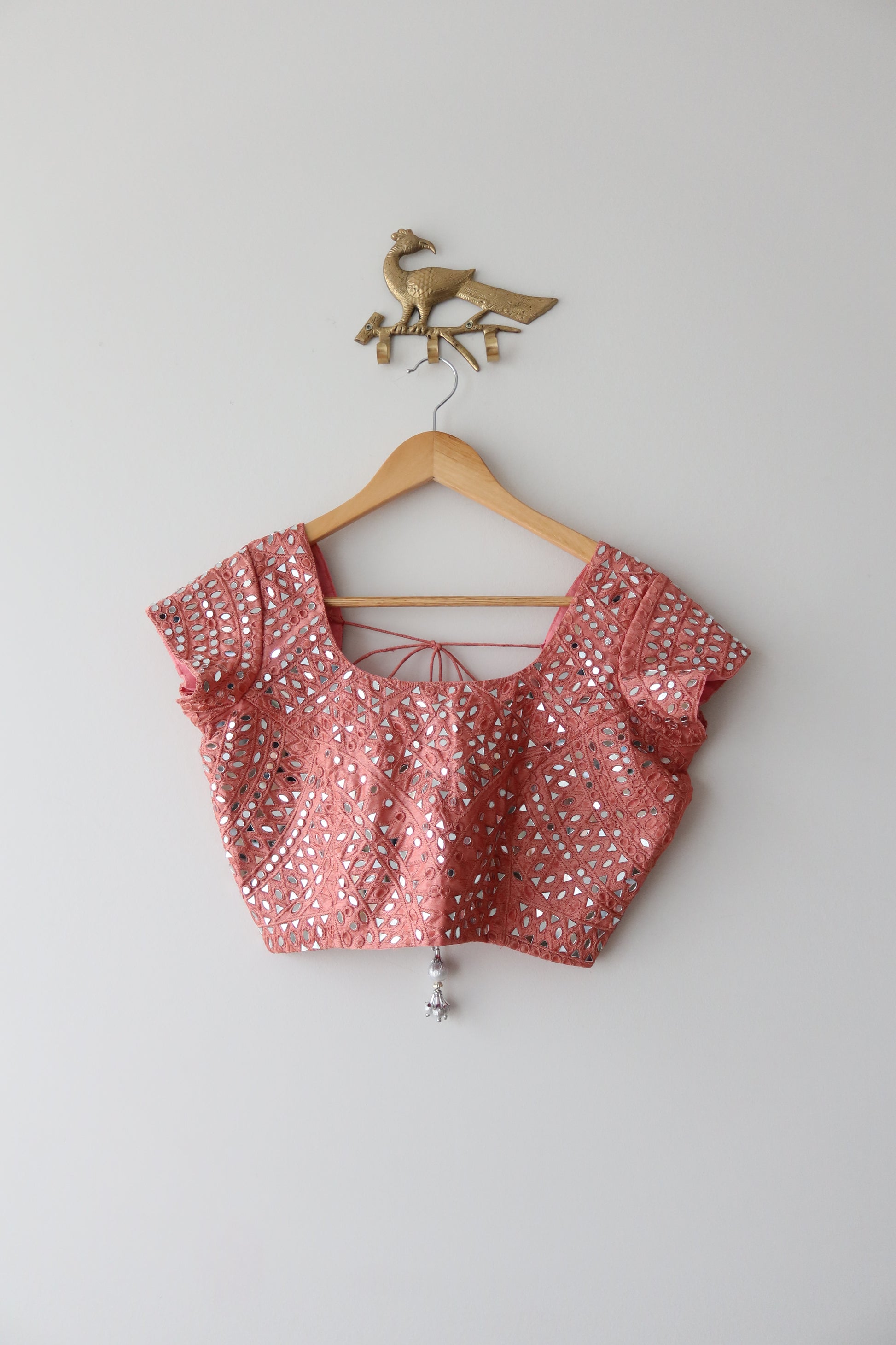 Blush Pink Organza Mirrorwork Sari with Stitched Blouse