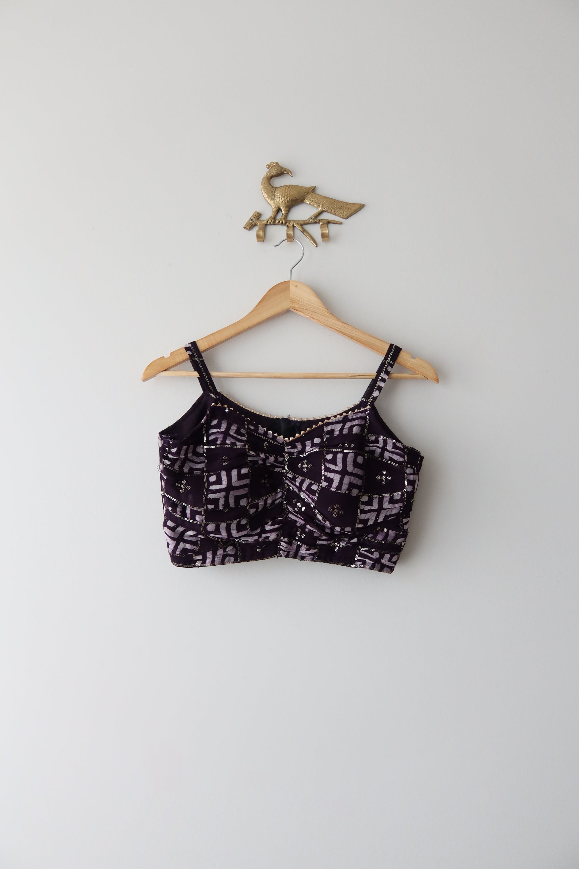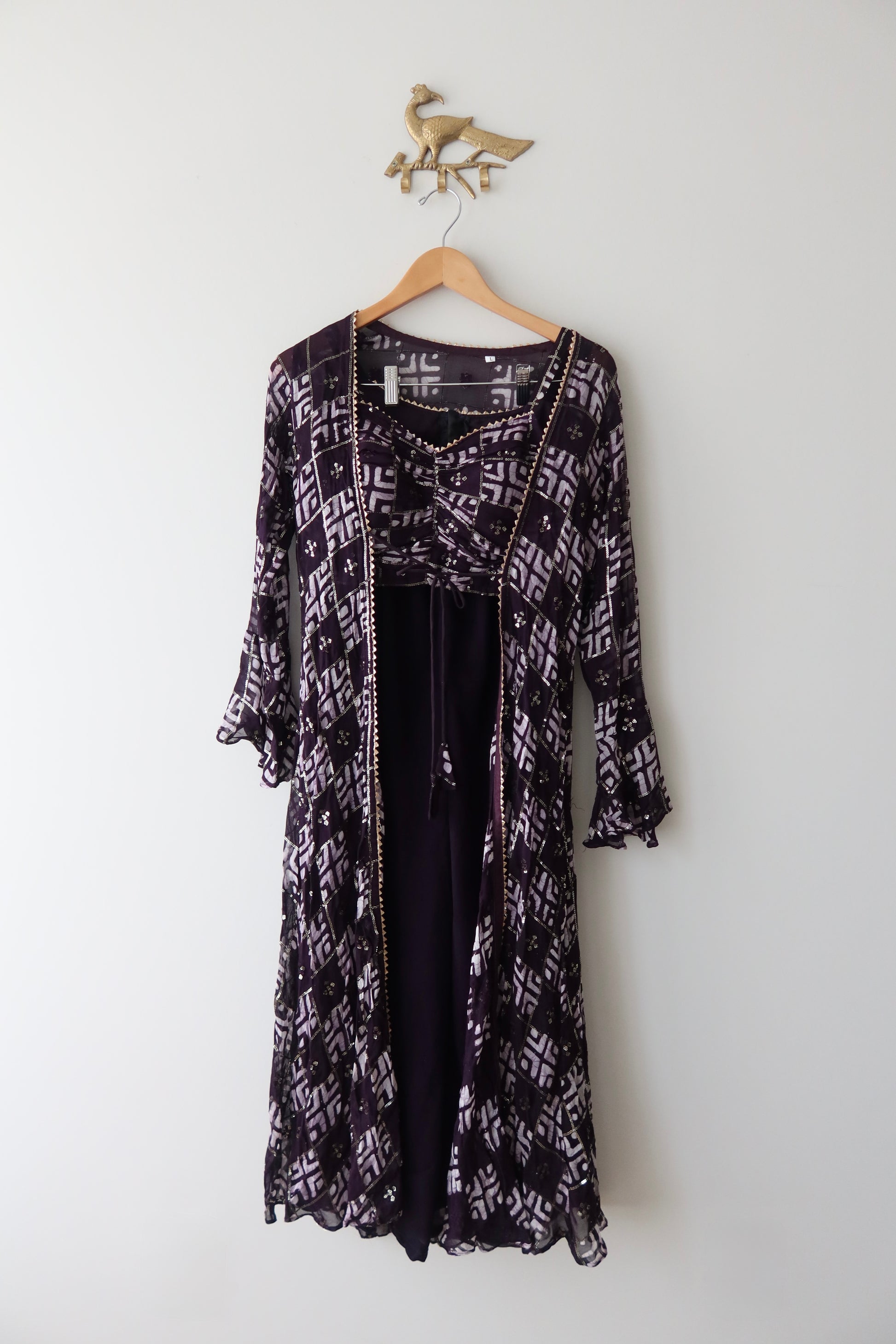 Stunning deep-purple co-ord that blends modern chic with ethnic drama. The halter crop top is fully covered in silver sequins and ties at the neck and back for a perfect fit. High-waisted straight pants give a sleek silhouette, while the sheer organza jacket (with subtle geometric print and delicate golden lace edging) adds that extra layer of elegance. Perfect for sangeet, cocktail parties, receptions, or any evening event.