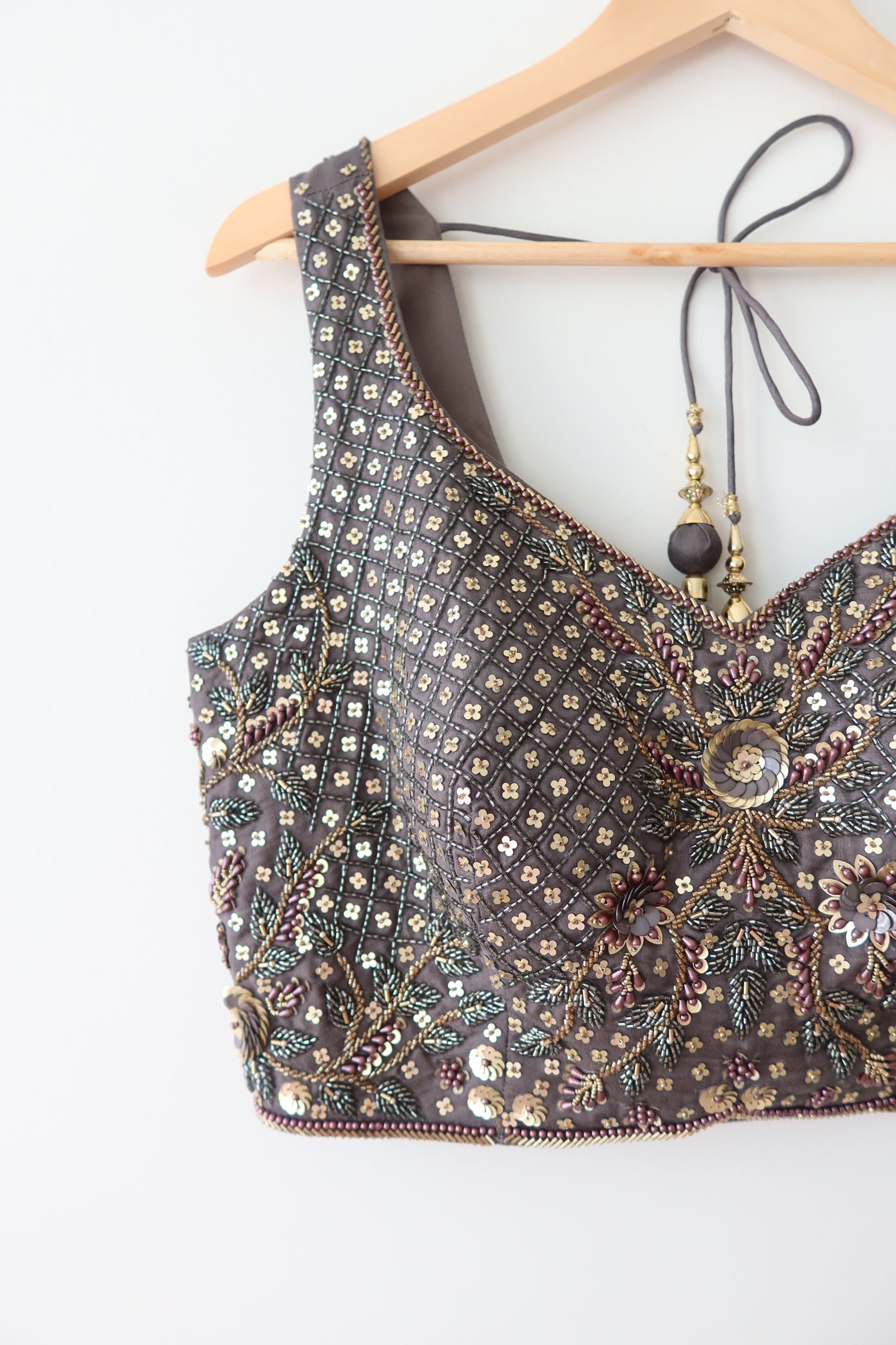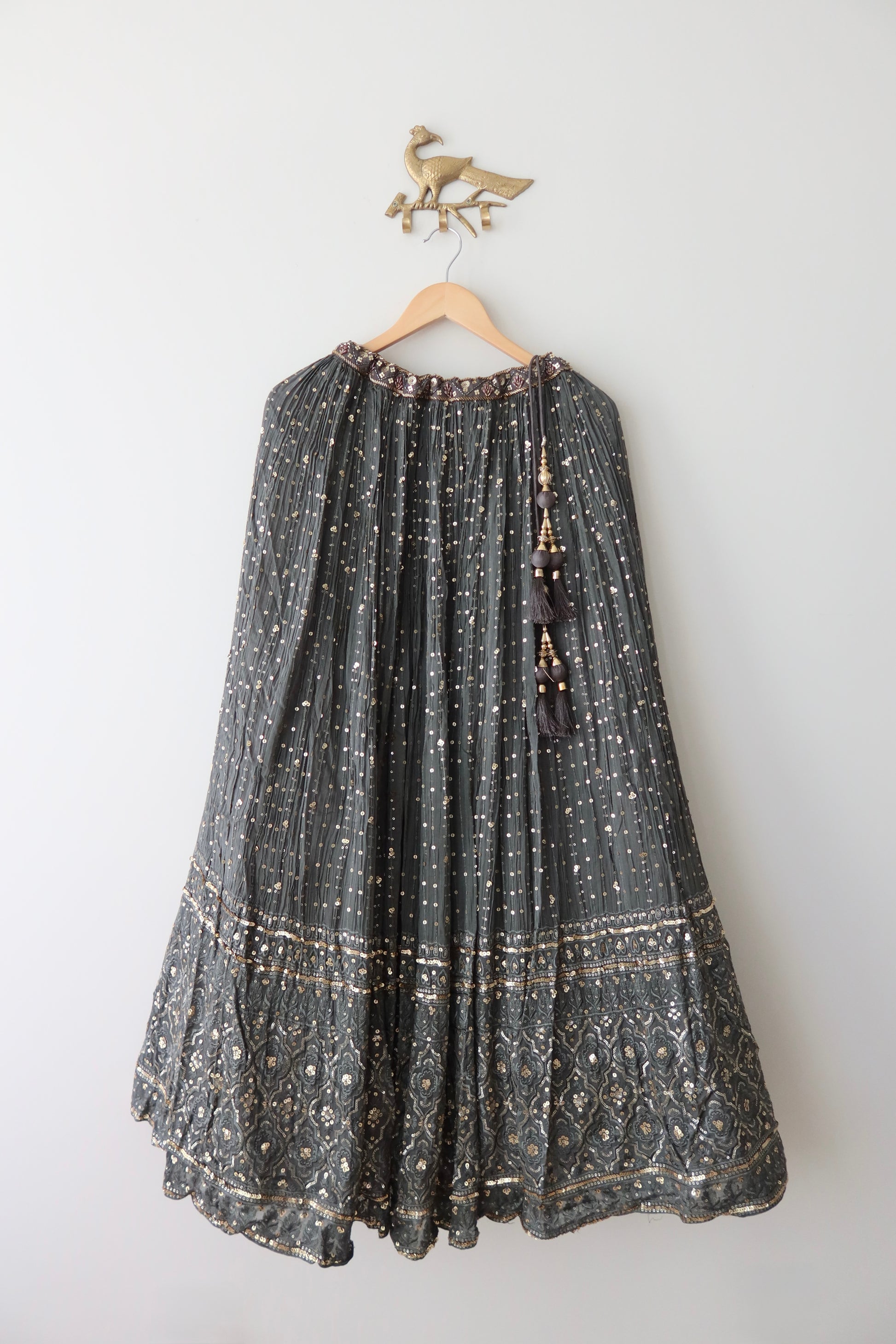 Beautiful gold, bronze, and gunmetal embroidery on blouse, beautiful sequins on skirt and cancan, matching gray net dupatta.