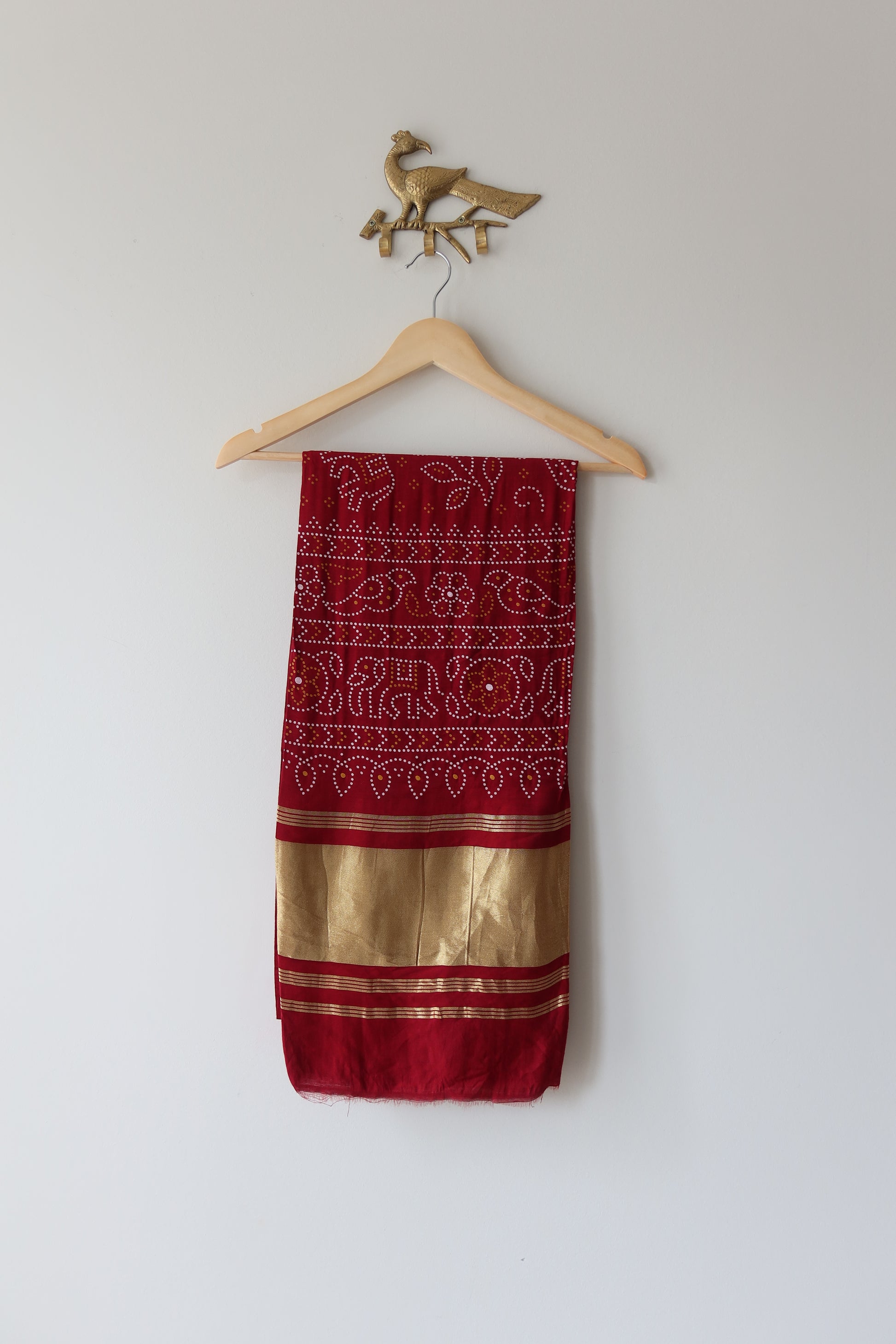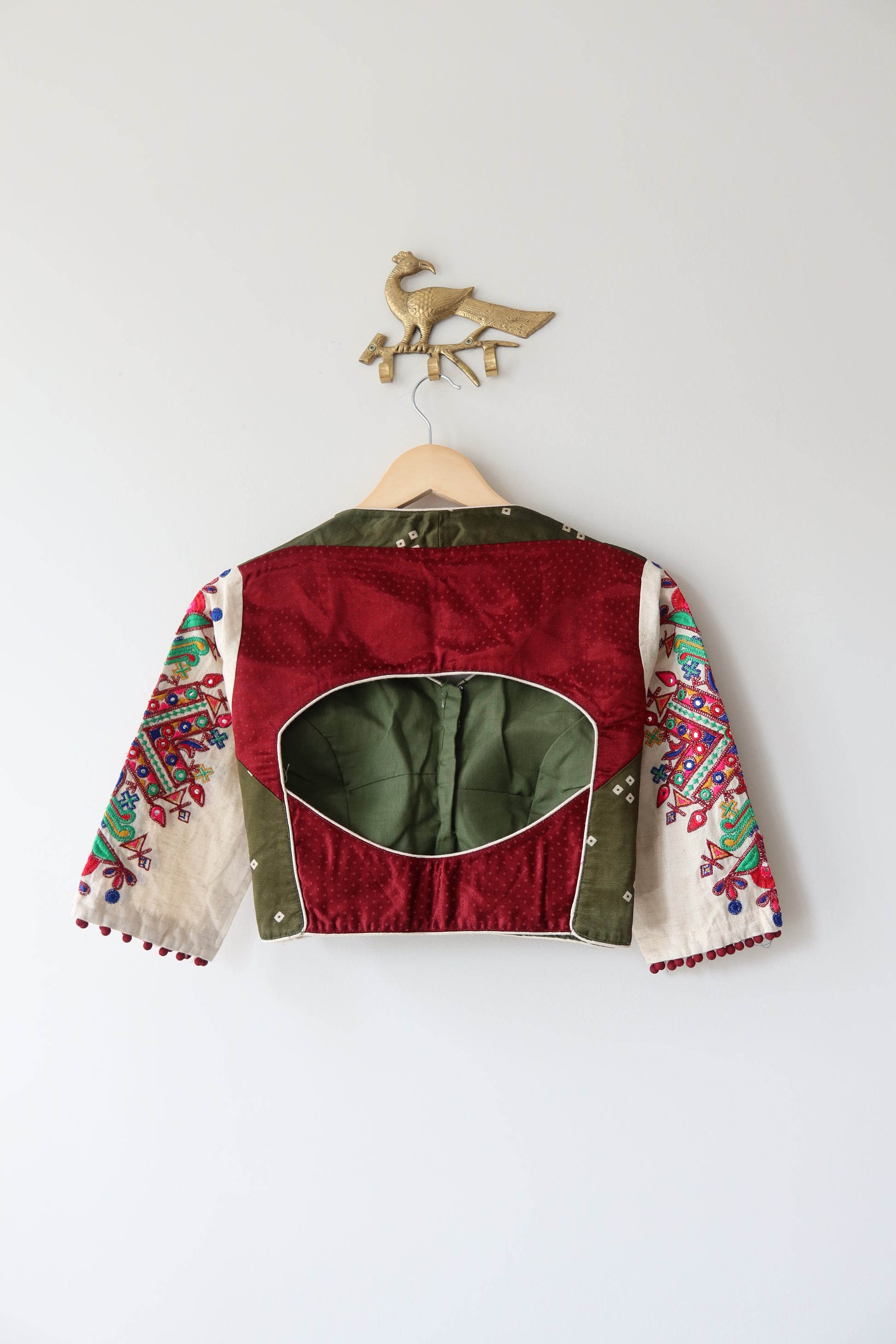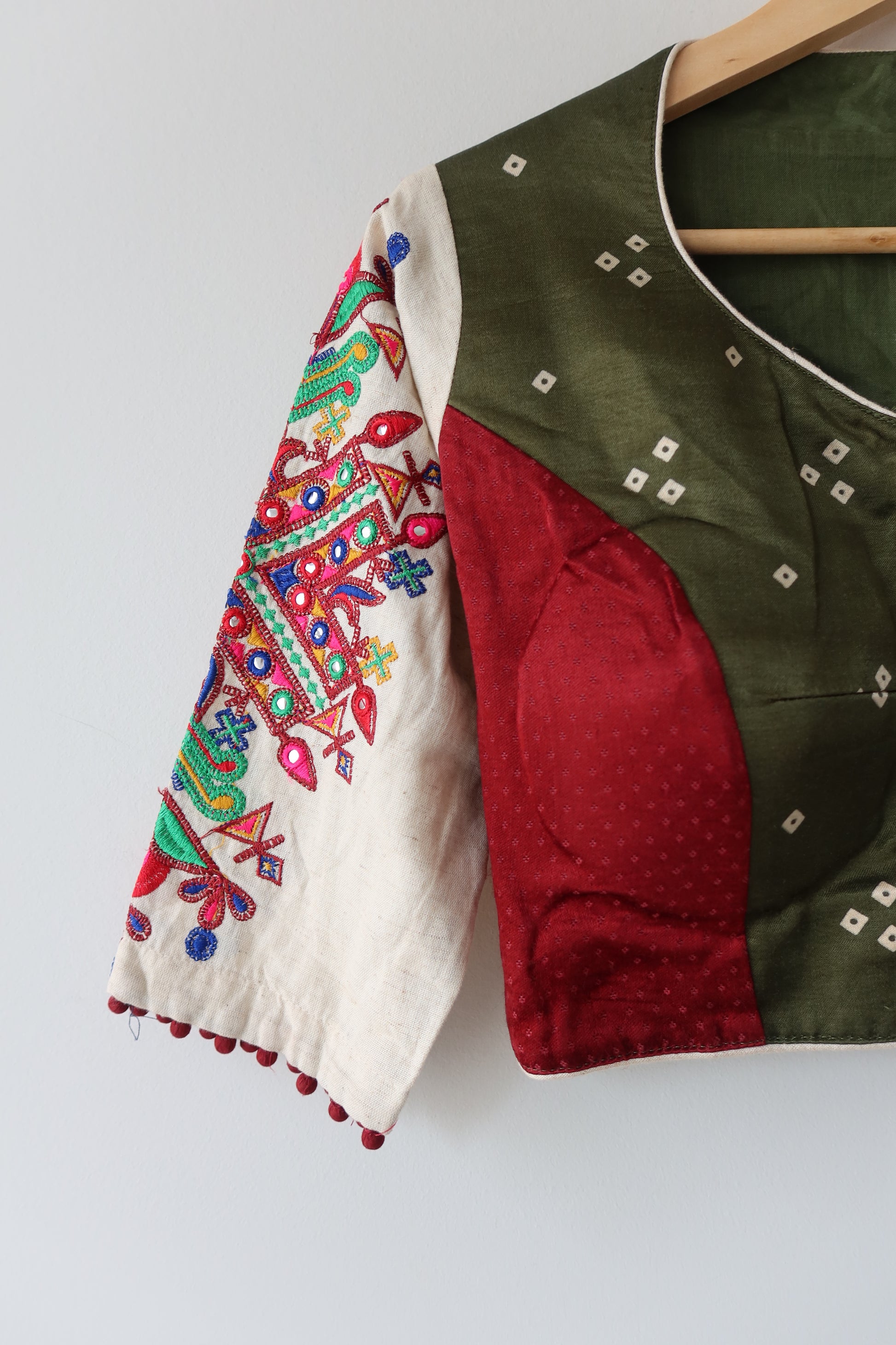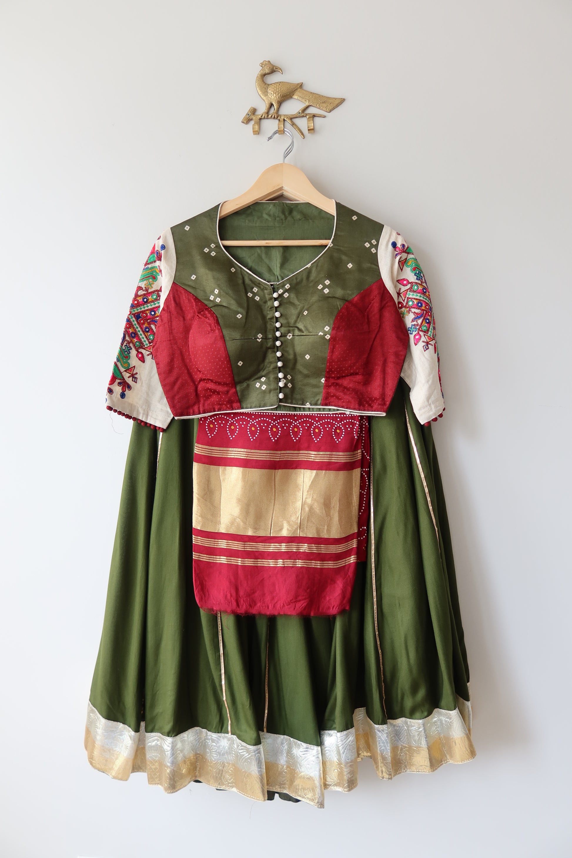 Green blouse with Kutchi design embroidery, paired with a lightweight flowing lehenga with Gota Patti embroidery and a maroon dupatta featuring bandhani work. Accentuate with statement jewelry and heels for a sangeet, haldi, vidhi, or cocktail ceremony.