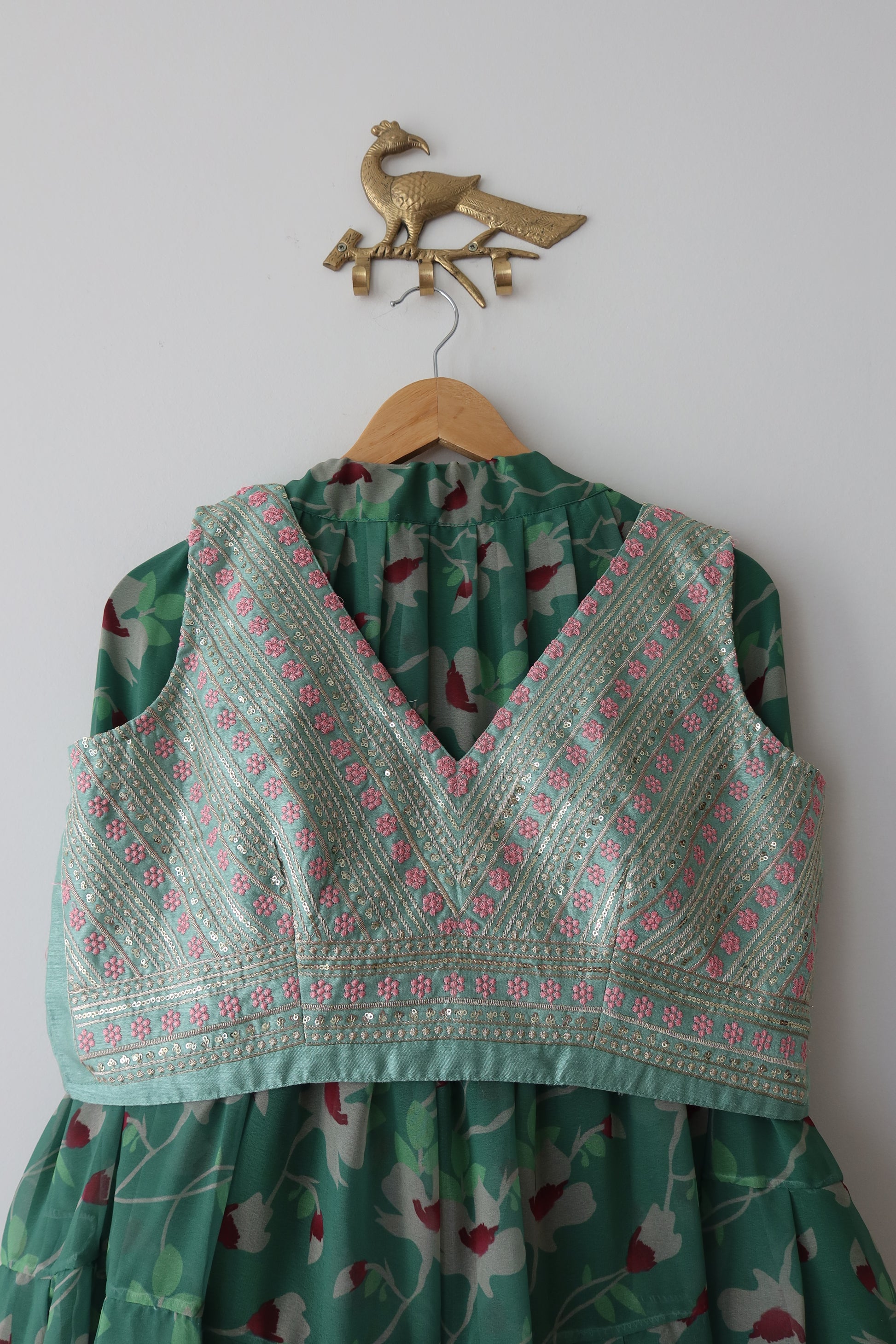 Lightweight Sea Green Lehenga Set Silk top, georgette skirt, matching net dupatta.