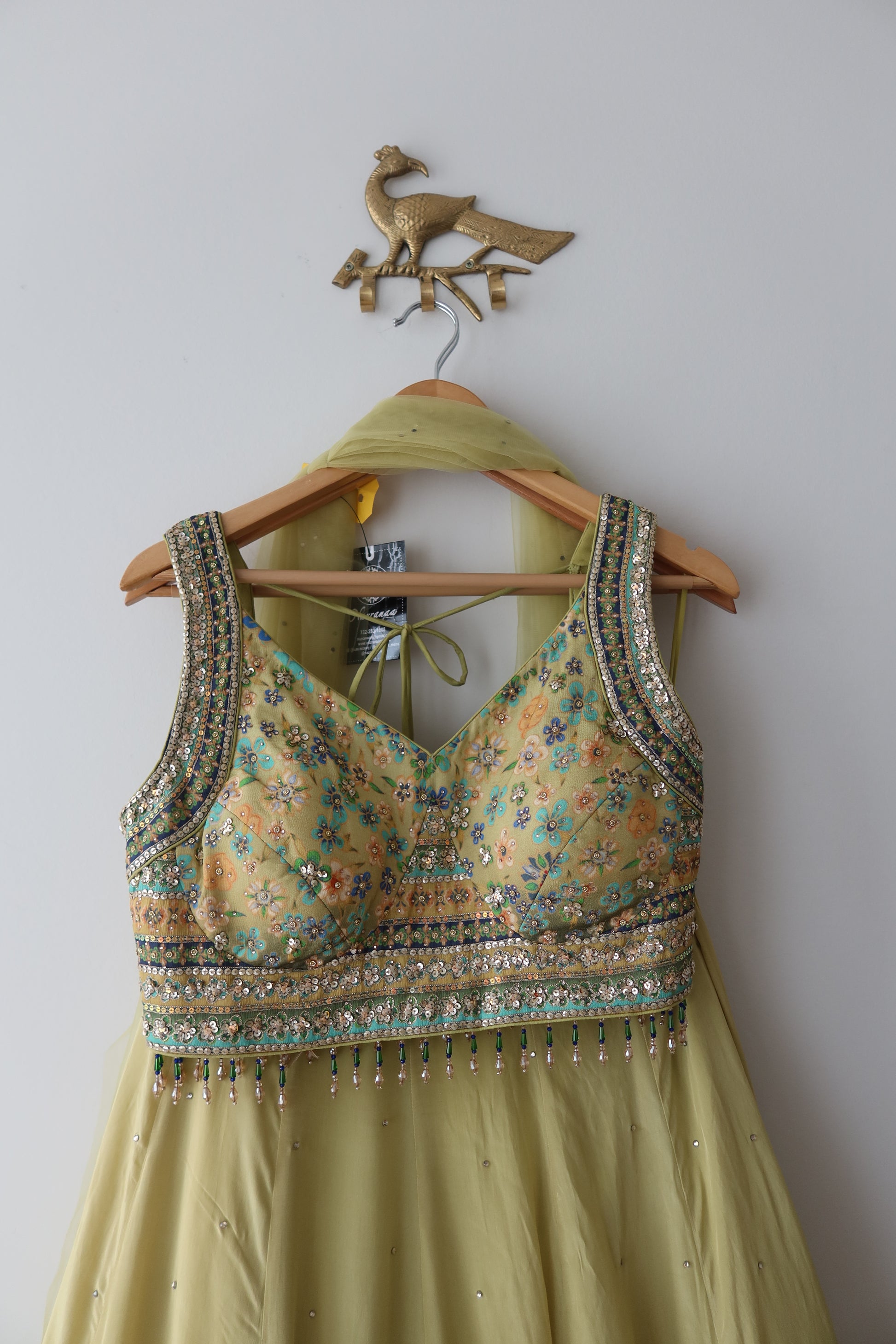 Glamorous and ethereal, this pre-loved Nazraana lime-green lehenga set is in pristine condition and still comes with original tags. The delicate net lehenga is scattered with tiny sequins that catch the light beautifully, creating a soft shimmer with every movement. Paired with a heavily embellished raw-silk blouse in pastel floral print, featuring intricate zardozi, sequins, beads, and stone work on the neckline and hem. Includes a matching net dupatta with four-side borders and a built-in cancan for perfect flare and volume. Perfect for weddings, receptions, or any grand celebration—this XS beauty (bust 36") offers luxury designer vibes at a fraction of the original price.