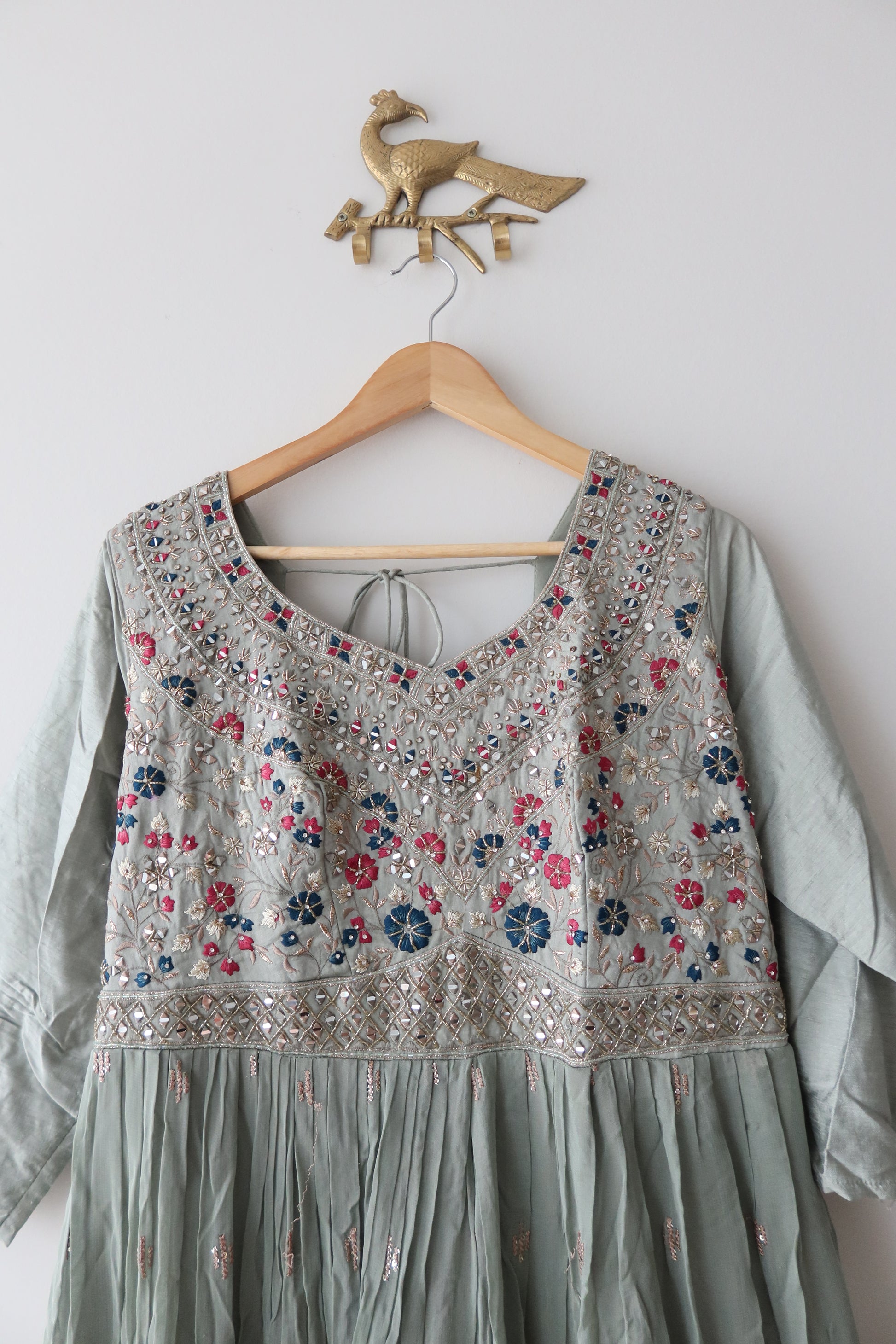This dreamy pastel mint Anarkali is pure elegance! Crafted from flowy mulmul/chanderi silk, it features breathtaking multi-colored resham embroidery with navy, magenta, and ivory florals, shimmering mirror work, and golden gota detailing on the yoke, sleeves, and cuffs. The flattering flared silhouette has subtle golden booti sprinkles all over, a graceful keyhole neckline, and a tie-up back for the perfect fit. Full sleeves and floor-length panels create a royal, twirl-worthy look that photographs beautifully.