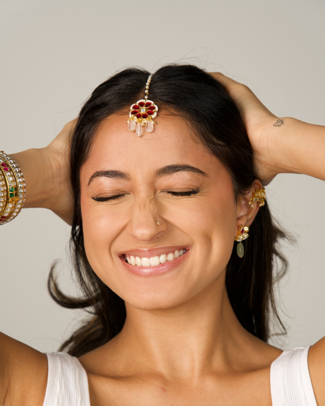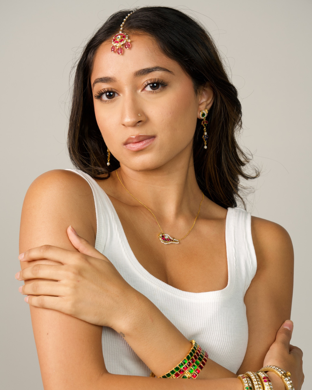 Every piece is proudly made by our all-woman artisan team in Gujarat, India – brass base, colorful glass stones set in traditional Kundan style, finished with rich gold or silver foil. Bold, lightweight, and dripping with festive sparkle – perfect for layering with your everyday fits or turning heads at the next shaadi. Made in India, made for you.