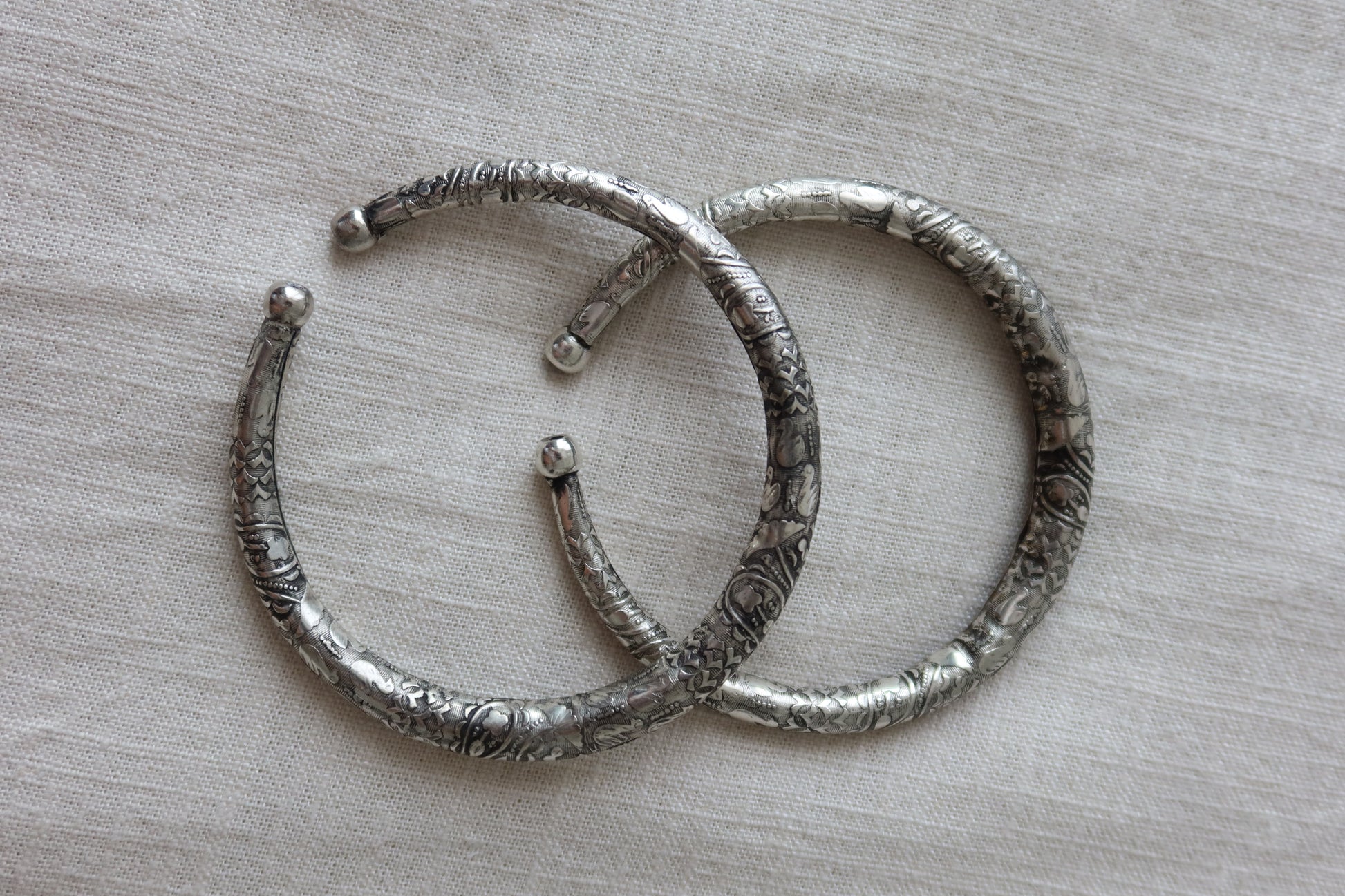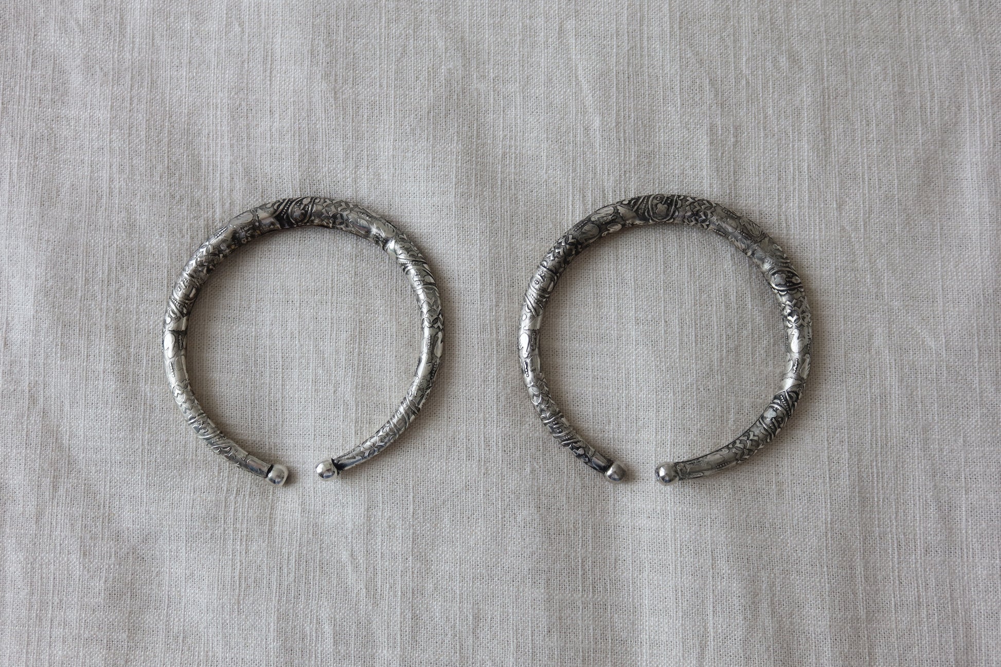 A striking pair of silver Hasli anklets, also known as payal, featuring a bold and traditional design, perfect for enhancing your ethnic look with elegance. Lightweight.