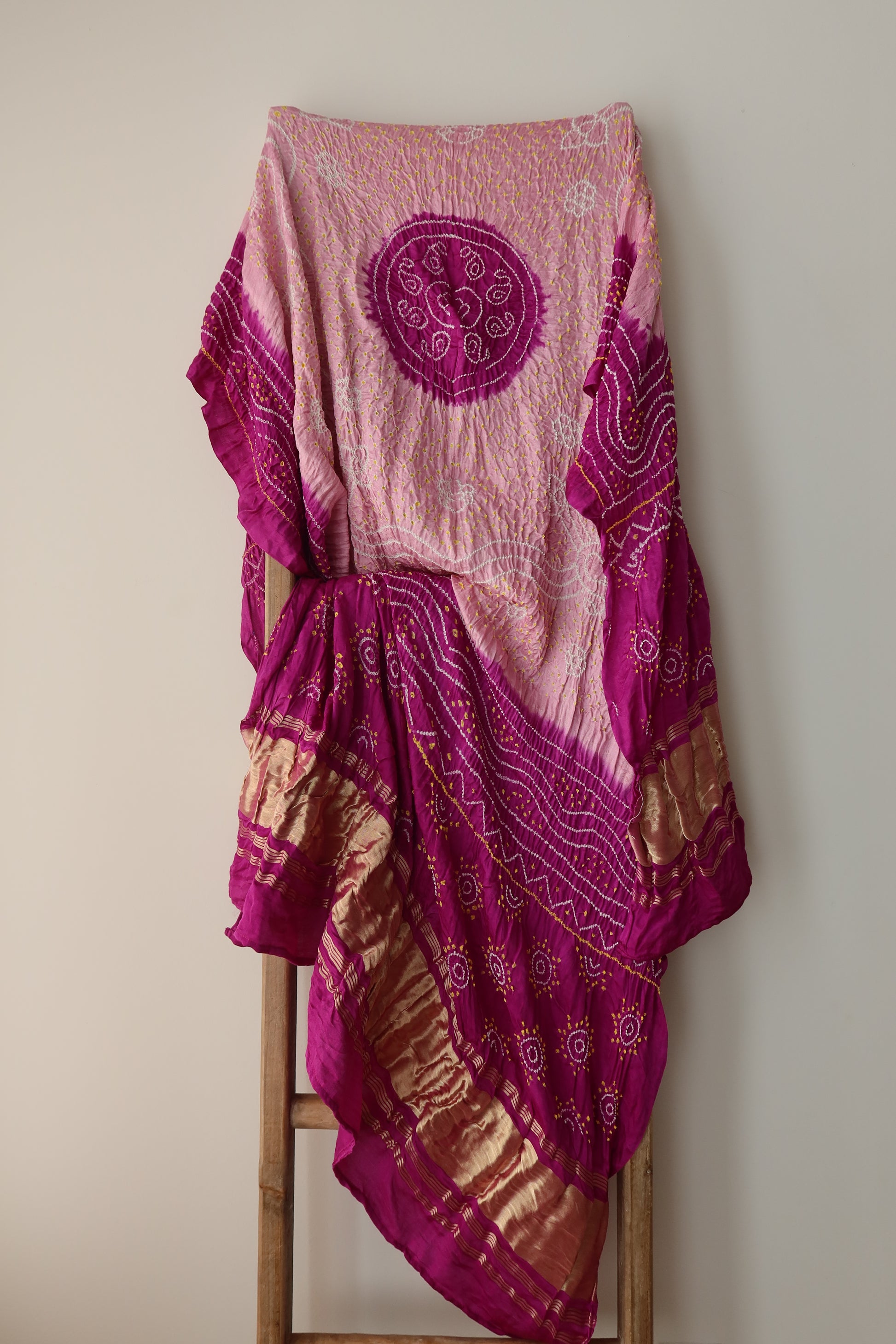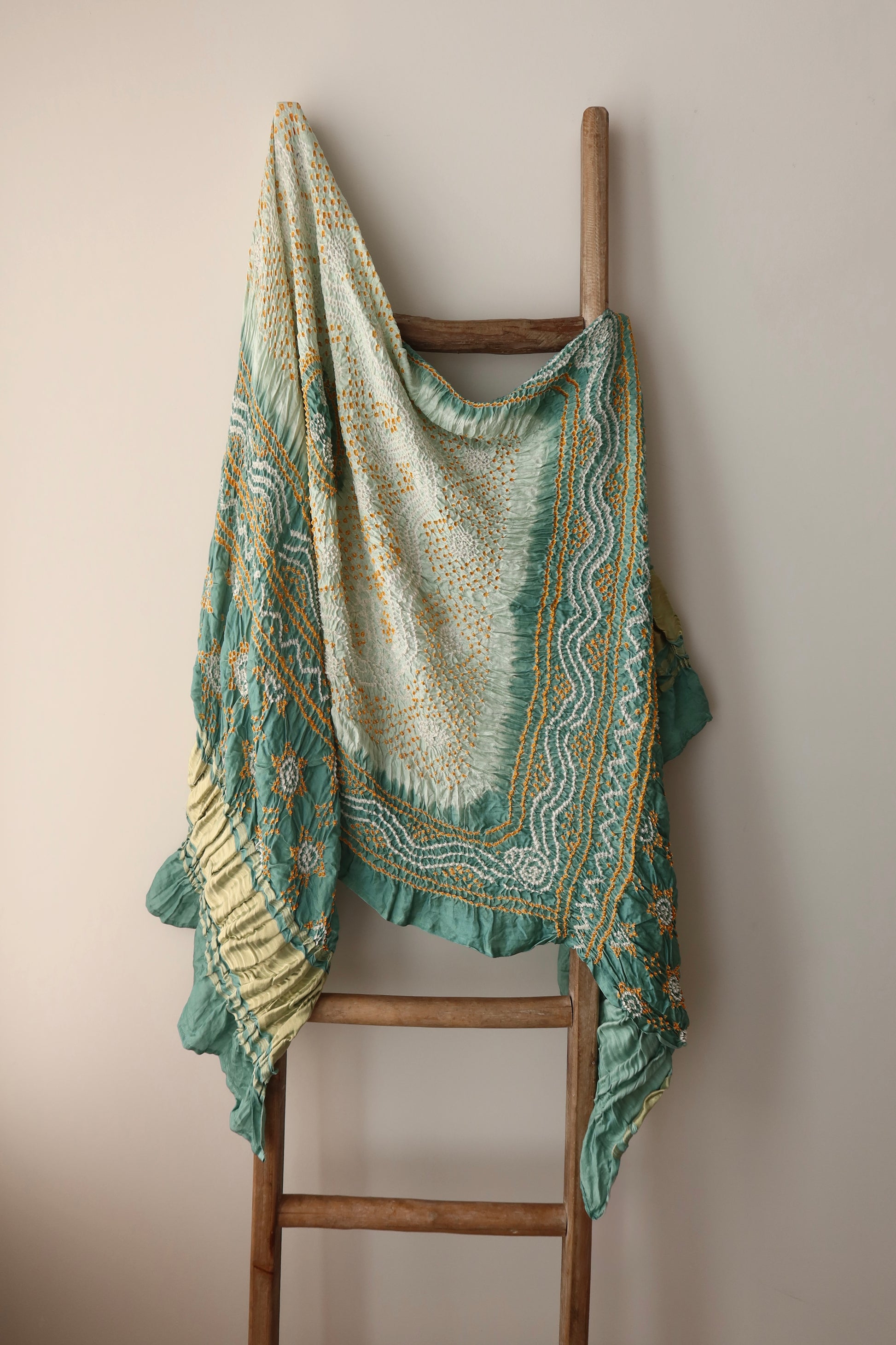 Hand dyed By.Ekta bandhani dupatta made from pure gaji modal silk and ladgi pata, resulting in an extremely soft fabric. Versatile and beautiful, it is the perfect addition to any outfit, whether it be a lehenga, kurta, or statement piece. It even pairs well with jeans and a shirt.