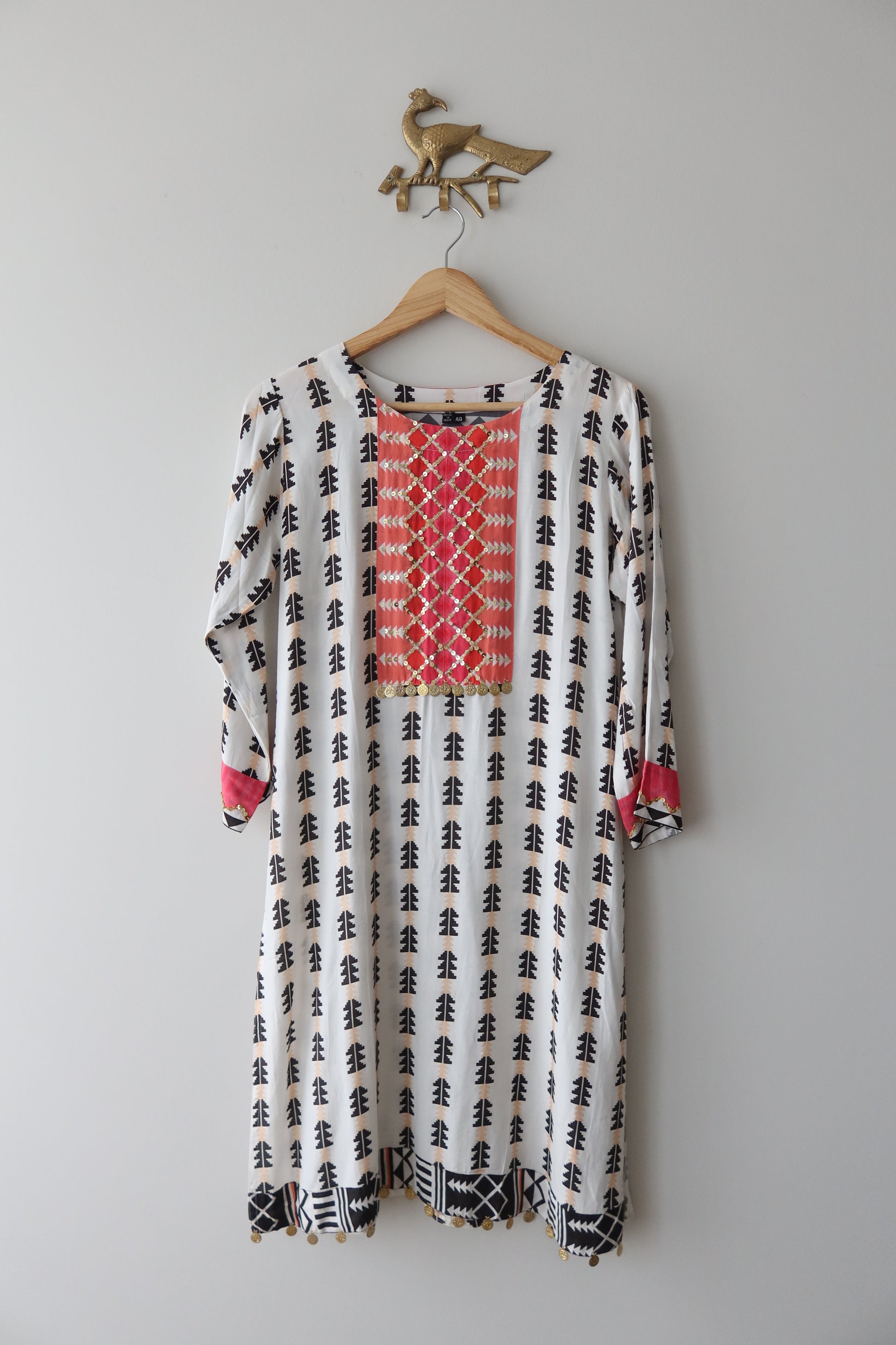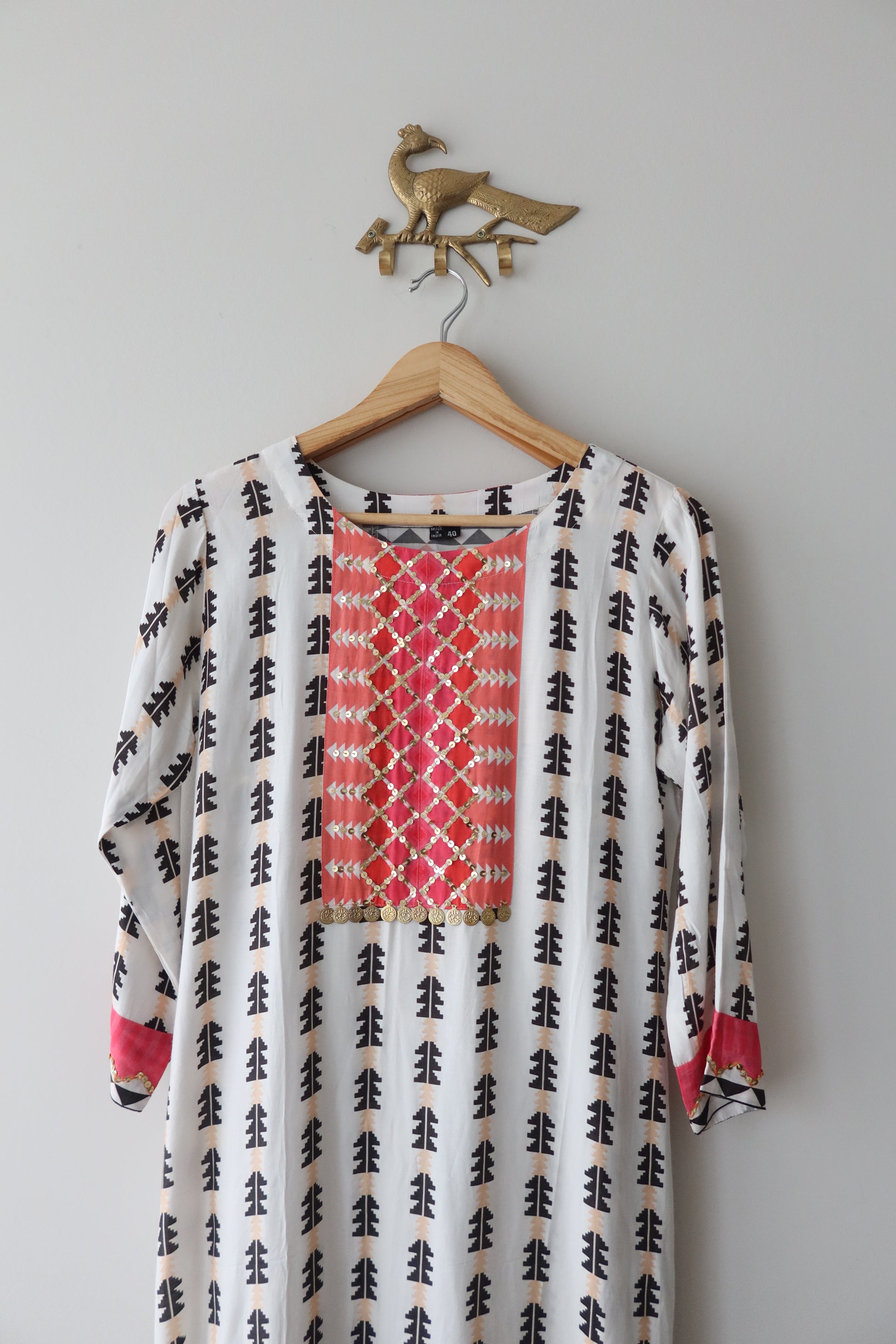 Perfect fusion of modern and traditional! This stunning white co-ord set features a relaxed-fit top in breathable cotton with an all-over black & peach geometric print. The highlight is the vibrant red yoke panel richly embroidered with mirror-work, sequins, and golden thread in a classic criss-cross pattern, finished with cute gold button detailing on the sleeves. Paired with comfy straight-cut pants in the same print – effortless yet so put-together.