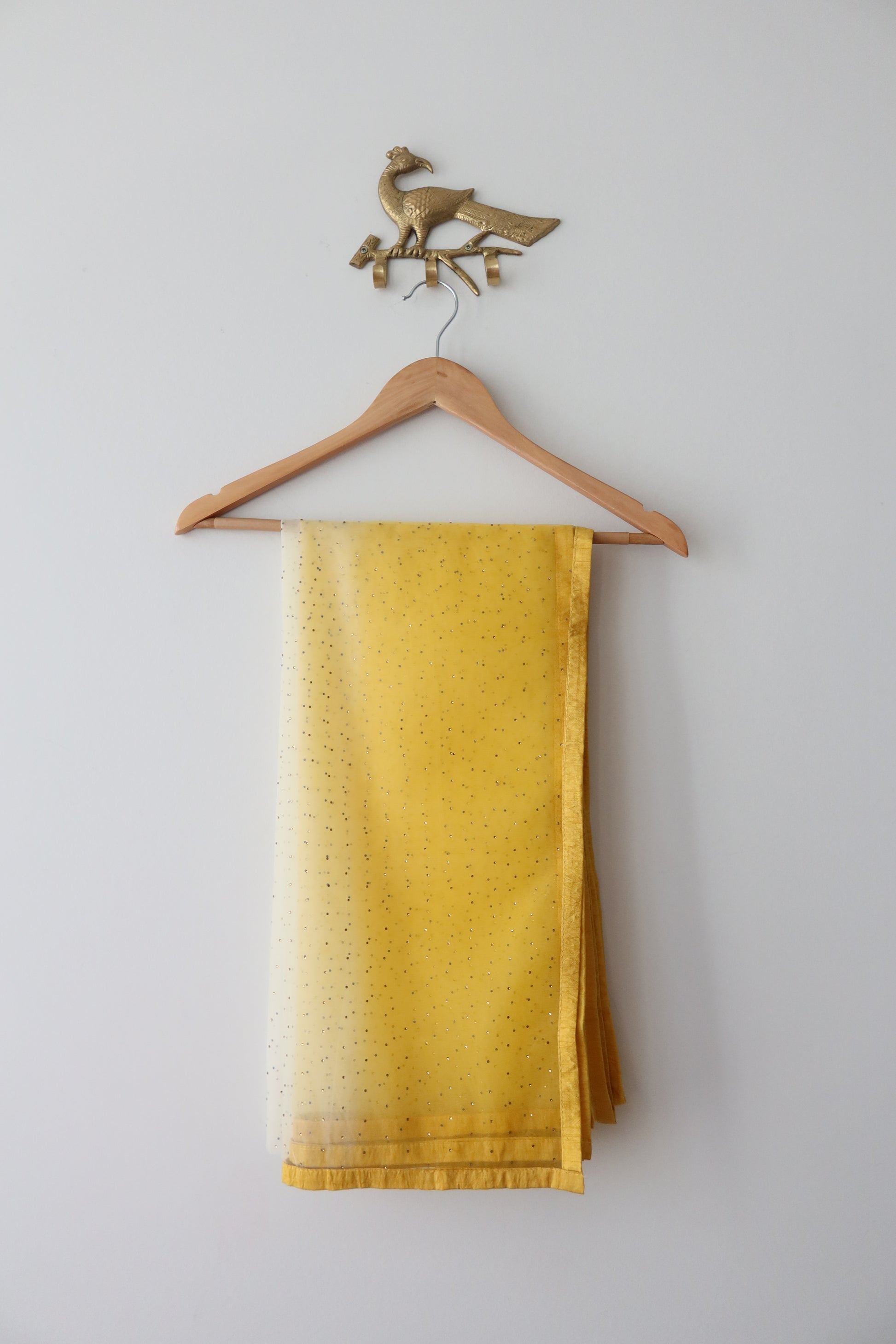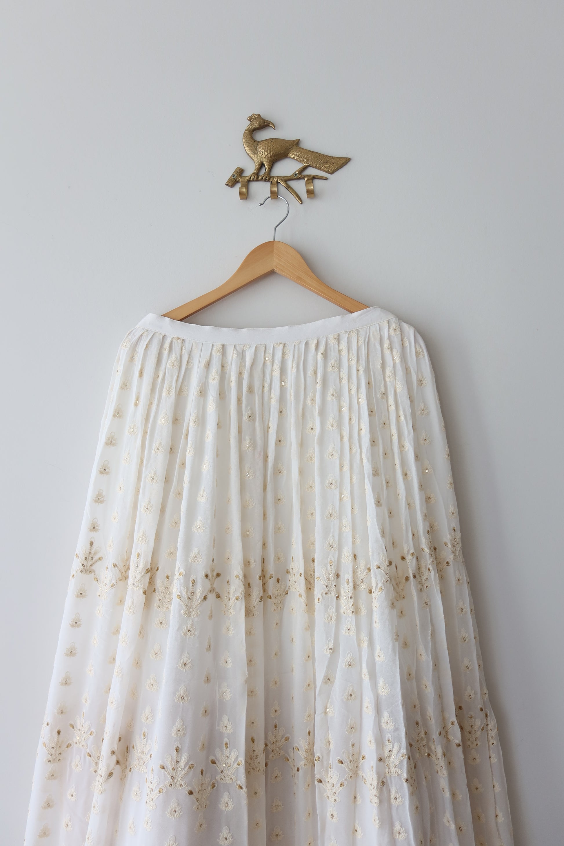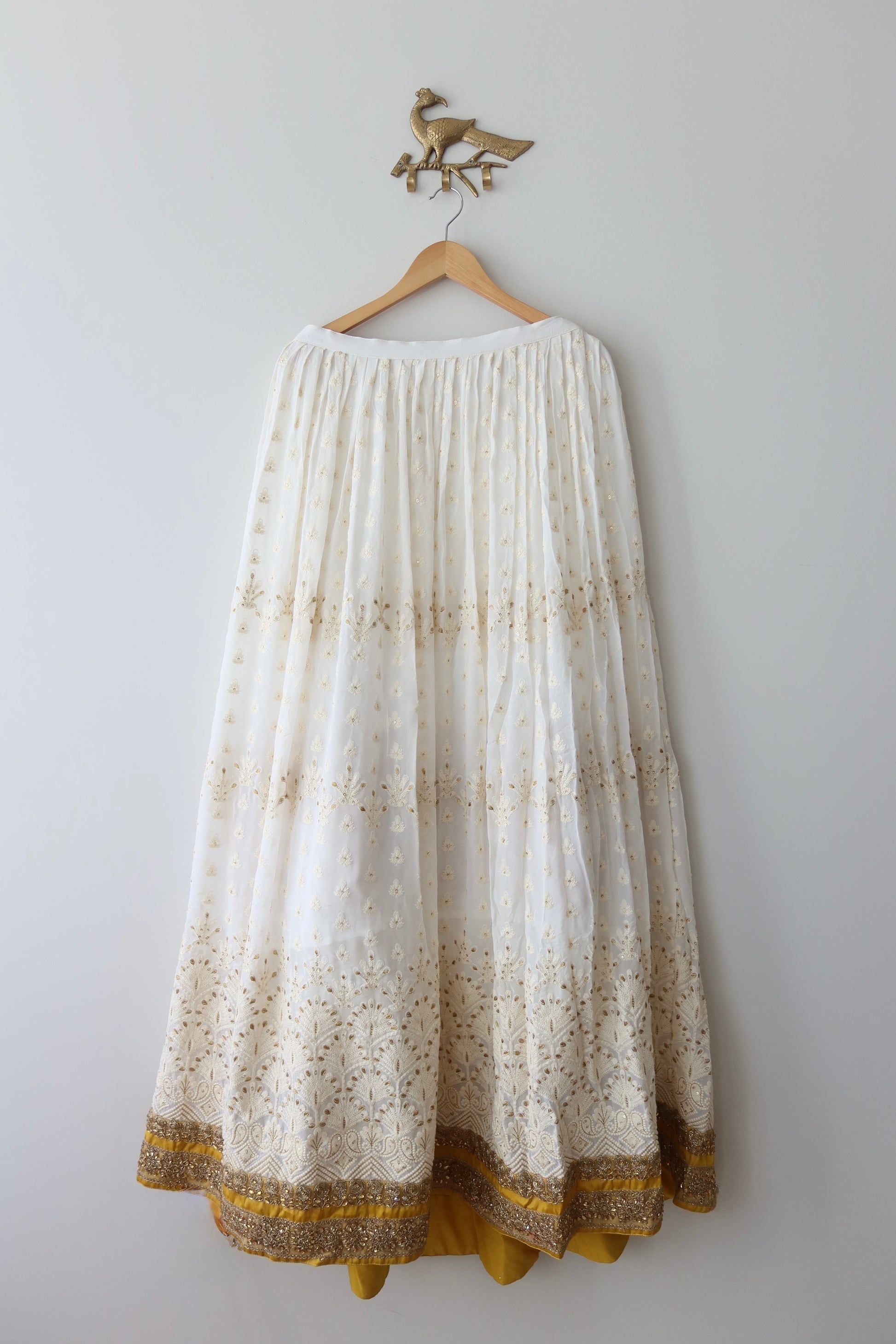 This bright and beautiful set features a rich yellow silk blouse paired with a heavily embroidered lucknowi white skirt that has a contrasting yellow border and built-in cancan for perfect flare and volume. The soft net dupatta in white with subtle detailing completes the look, draping elegantly.