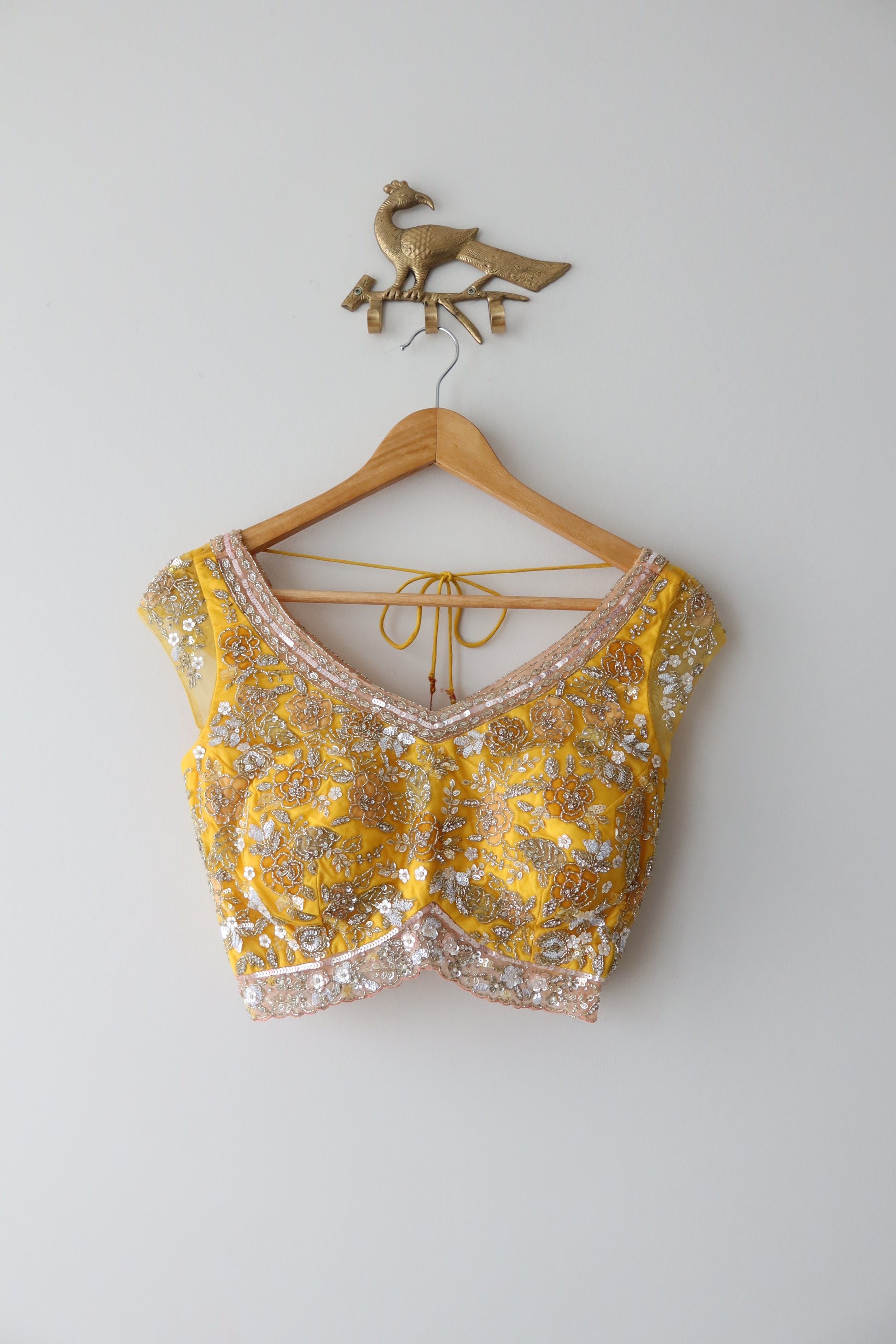 Size: 34 inch bust (with margin) | Skirt waist 28–30 inches (elastic + drawstring) Condition: Preloved – Excellent (worn once, no missing mirrors/sequins) Occasion: Haldi, mehendi, day wedding, summer reception, engagement, pujas, festive brunch