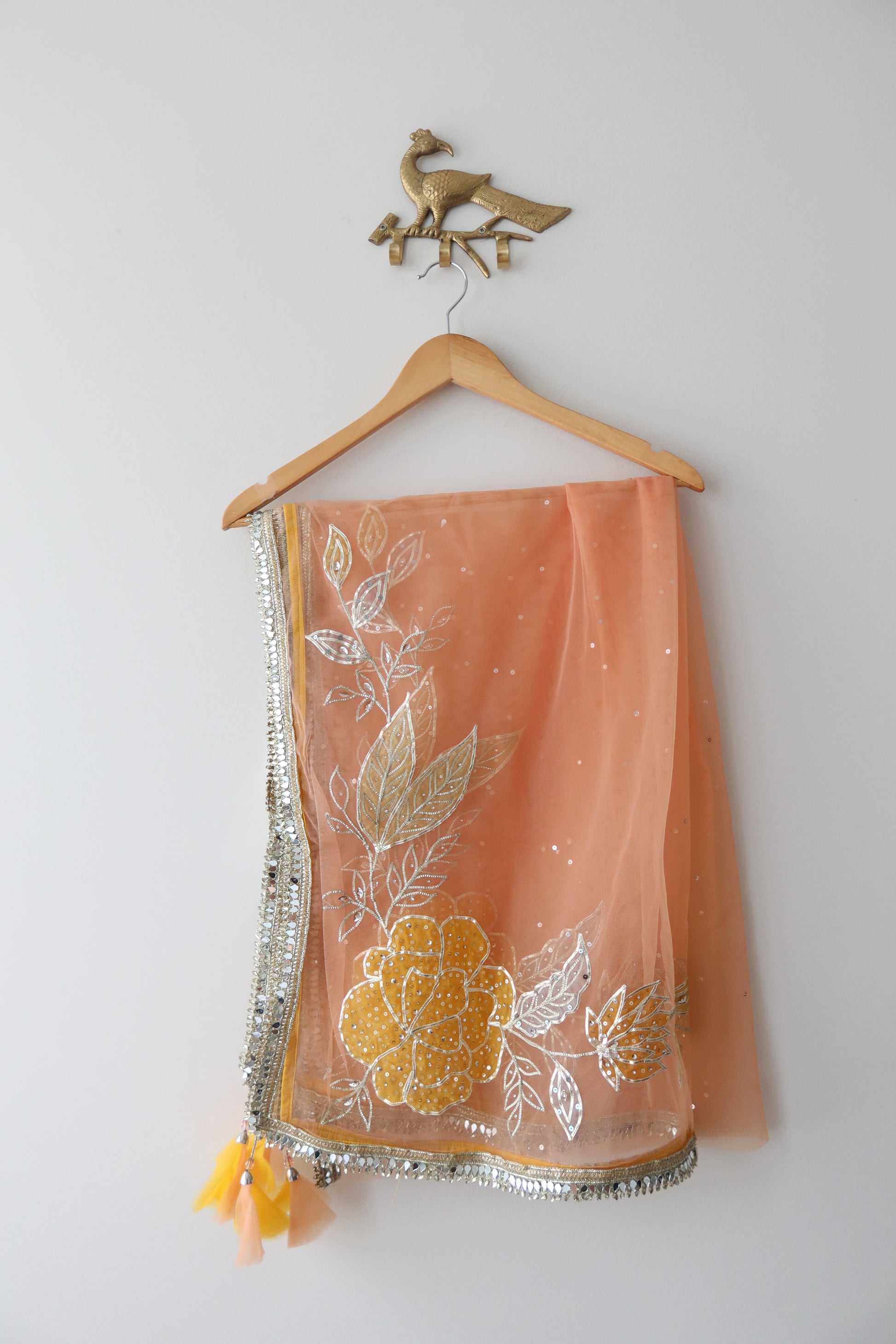 A delicious burst of summer colors! This dreamy pastel lehenga features a sunshine-yellow silk blouse covered in intricate silver zari, sequin & thread embroidery, paired with a feather-light mint-green net skirt sprinkled with tiny sequins for subtle sparkle. The peach-orange hand-painted net dupatta (with real mirror border & colorful tassels) ties the sorbet palette together beautifully. Perfect for haldi, mehendi, day weddings or any happy celebration.
