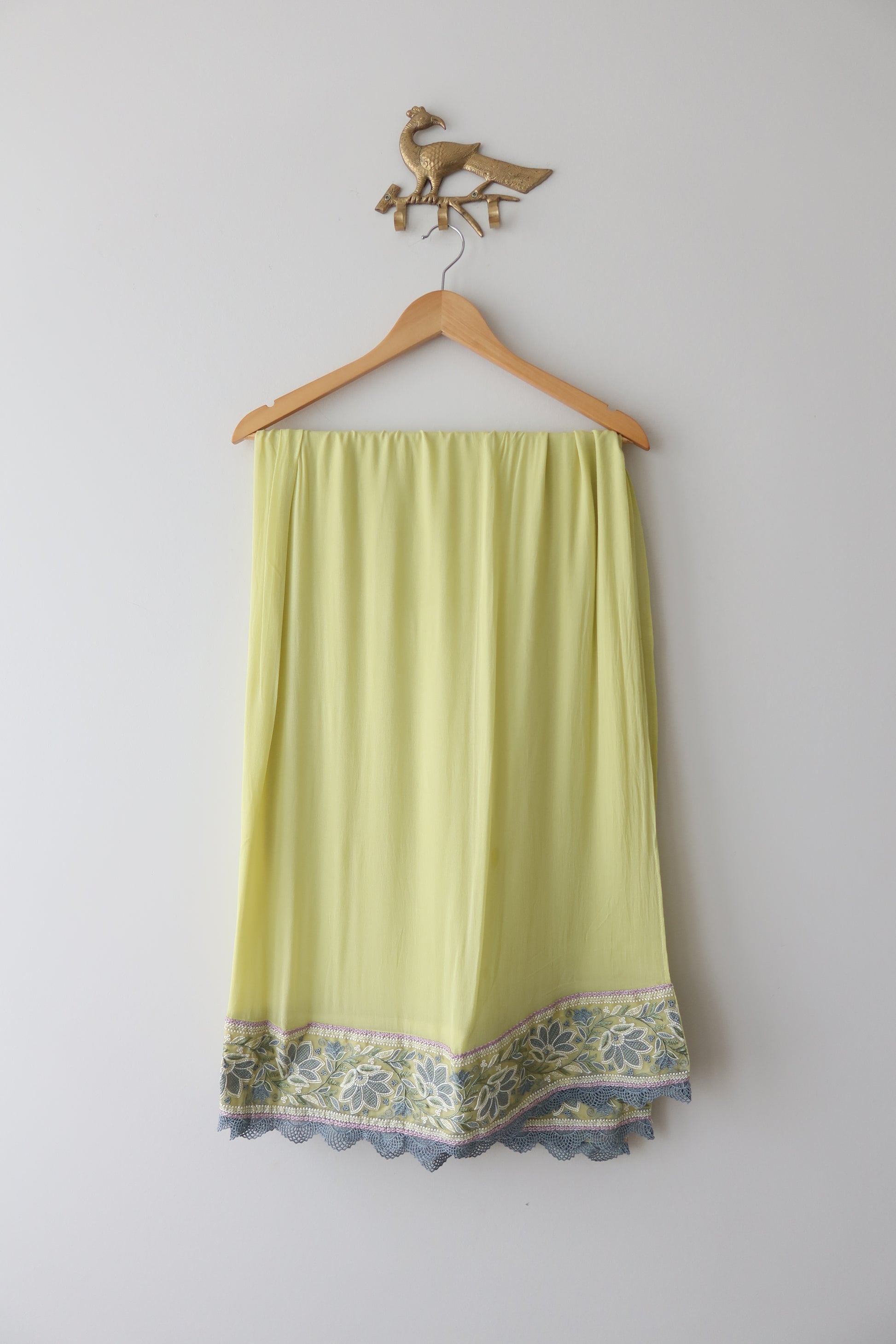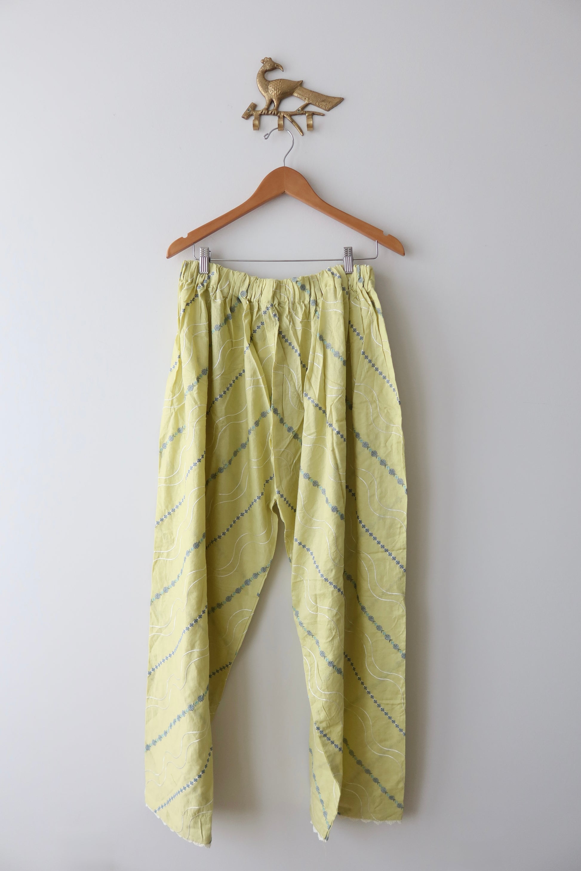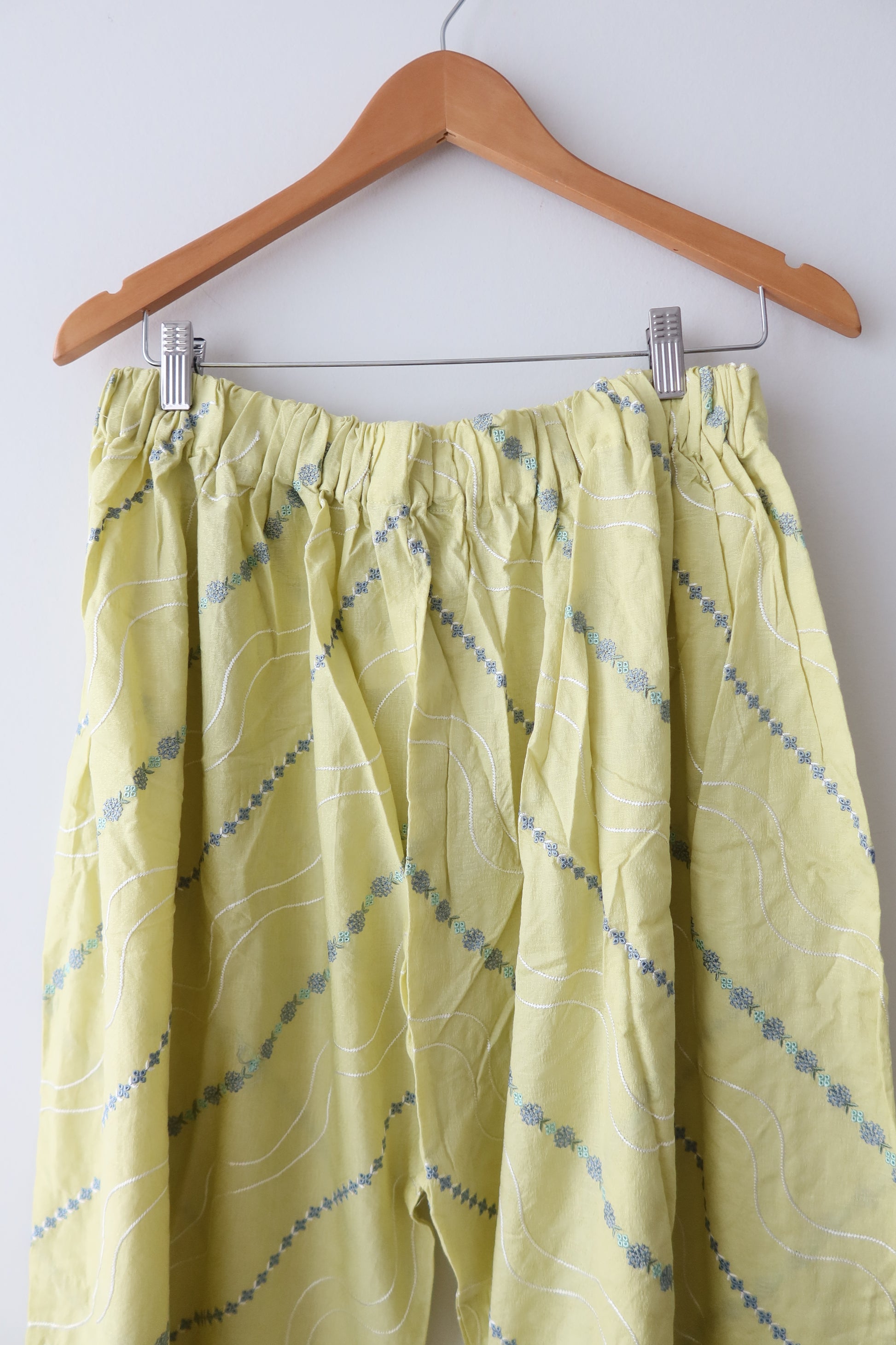 Elegant and breezy, this pastel yellow dobby outfit in size XL embodies subtle sophistication with a monochromatic aesthetic. The loose-fit paneled kurta features minimal embroidery details on the front placket, neckline, and sleeves, showcasing delicate floral motifs in soft pastel threads. It is paired with a heavily embroidered farshi shalwar adorned with intricate wavy patterns, beadwork, and lace trims for added flair. The tonal embroidered dupatta enhances the overall harmony, creating a cohesive and graceful look. Price includes stitching with laces, tassels, pearls, and embellishments matched to the image. Perfect for casual outings or semi-formal gatherings, offering comfort and cultural charm.
